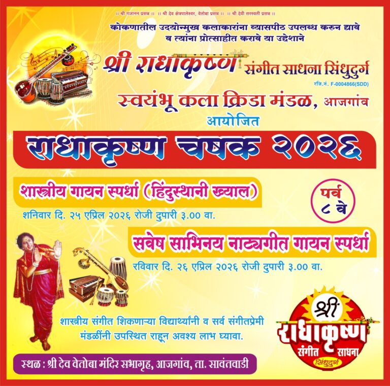 यानिमित्त २० एप्रिल रोजी “शिव झाला मांगिरीश” नाटकाचे आयोजन.. ⚡सावंतवाडी ता.१८-: सबनिसवाडा येथील श्री देव इस्वटी महापुरुष मंदिर चौथा शिखर कलशारोहण वर्धापनदिन सोहळा रविवार १९ एप्रिल रोजी संपन्न होत असून,यानिमित्त मंदिरात विविध धार्मिक कार्यक्रमांचे आयोजन करण्यात आले आहे.सकाळी ७:३० ते १२:०० श्री देव महापुरुष विद्या आणि सग्रह सौर याग ,दुपारी १२:३० ते ०१:०० महाआरती,दुपारी ०१:००…