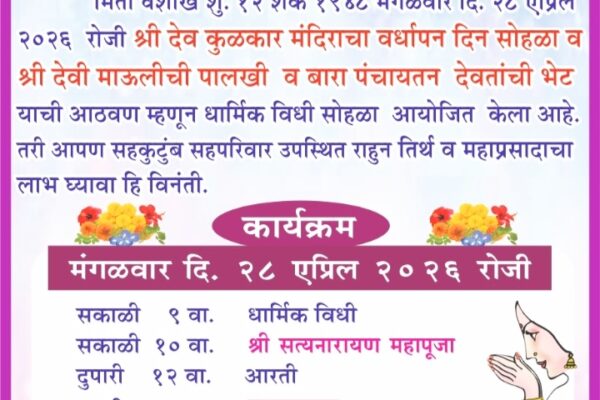 तसेच “पंढरीचा पहिला वारकरी ” दशावतारी नाटकाचेही आयोजन.. ⚡सावंतवाडी ता.२७-: श्री कुलदेवता युवक कला, क्रीडा मंडळ मळेवाड, आयोजित प्रतिवर्षीप्रमाणे शुक्रवार दि. १ मे रोजी सकाळी ११ वाजता.श्री कुलदेवता मंदिर, मळेवाड – देऊळवाडी येथे ” श्री सत्यनारायण महापूजा ” आयोजित करण्यात आली आहे.यानिमित्त सकाळी ११ वा. नामवंत कलाकारांनी रेखाटलेली आकर्षक भव्य खुली “रांगोळी स्पर्धा व प्रदर्शना…
