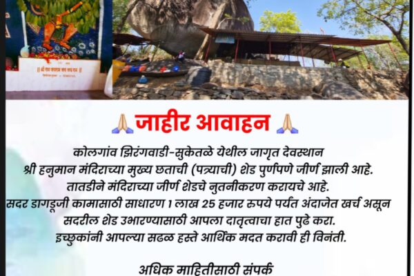 कोलगांव झिरंगवाडी-सुकेतळे हनुमान मंदिरासाठी मदतीचे आवाहन.. ⚡सावंतवाडी ता.३१-: तंत्रज्ञानाने जग जवळ आले असले, तरी सावंतवाडी तालुक्यापासून अवघ्या ३ किमीवर असलेल्या कोलगाव-झिरंगवाडी (सुकेतळे) येथे आजही केवळ ‘श्रमशक्ती’ आणि ‘अढळ श्रद्धा’ यांच्या जोरावर एक जागृत देवस्थान उभे आहे. निसर्गाच्या कुशीत, एका विशाल शिळेवर नैसर्गिकरित्या उमटलेली मारुतीरायाची प्रतिकृती आणि तिथे पोहोचण्यासाठी करावा लागणारा ३ किमीचा खडतर डोंगरप्रवास, हे…