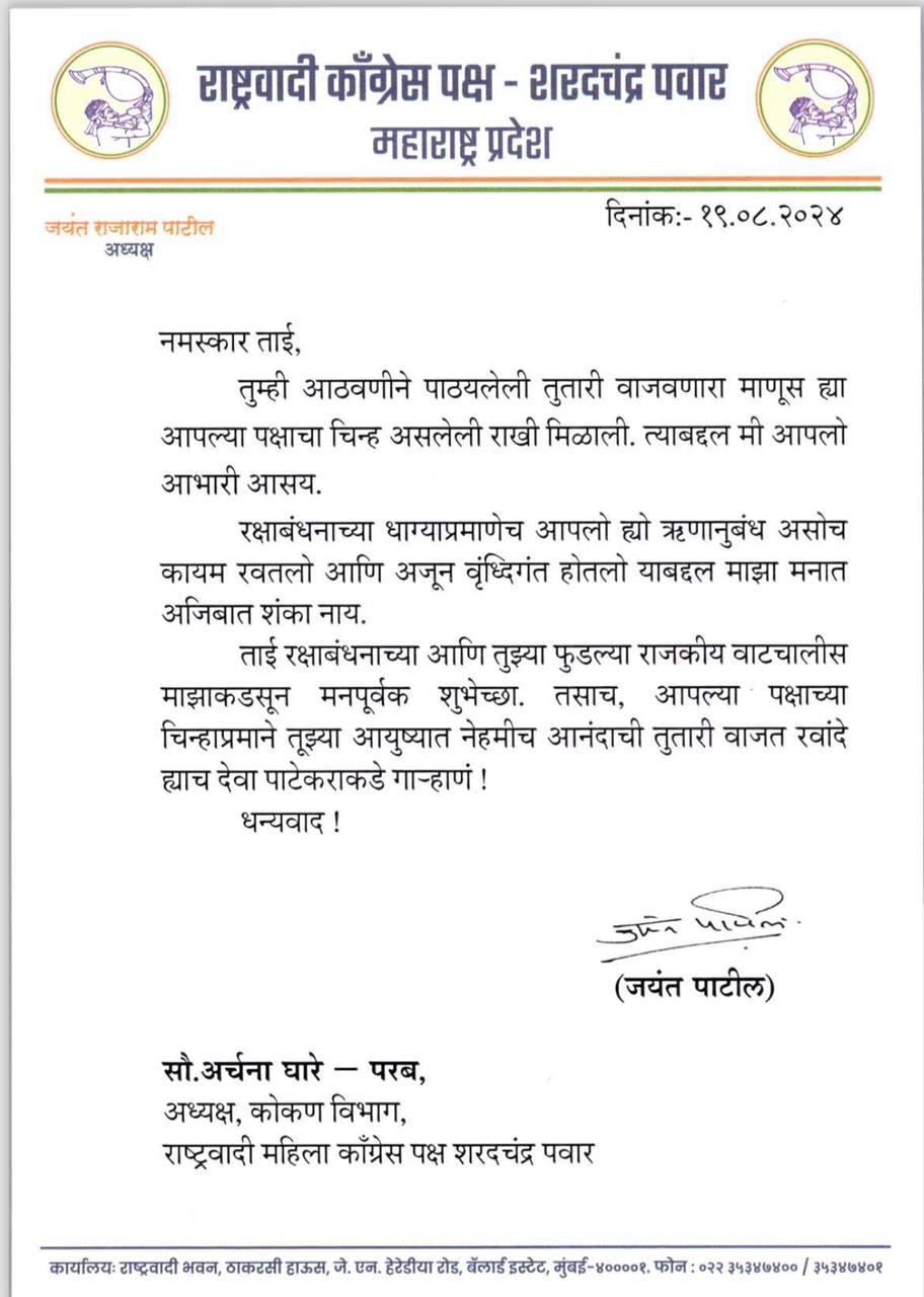 जयंत पाटील यांनी क्षाबंधनाला पाठविलेल्या राखीला चक्क मालवणी भाषेतून पत्र पाठवून शुभ आशीर्वाद दिले आहेत. या पत्रात आदरणीय जयंतदादा म्हणाले, तुम्ही आठवणीने पाठयलेली तुतारी वाजवणारा माणूस ह्या आपल्या पक्षाचा चिन्ह असलेली राखी मिळाली. त्याबद्दल मी आपलो आभारी आसय. रक्षाबंधनाच्या धाग्याप्रमाणेच आपलो ह्यो ऋणानुबंध असोच कायम रवतलो आणि अजून वृंध्दिगंत होतलो याबद्दल माझा मनात अजिबात शंका नाय. ताई, रक्षाबंधनाच्या आणि तुझ्या फुडल्या राजकीय वाटचालीक माझाकडसून मनःपूर्वक शुभेच्छा.