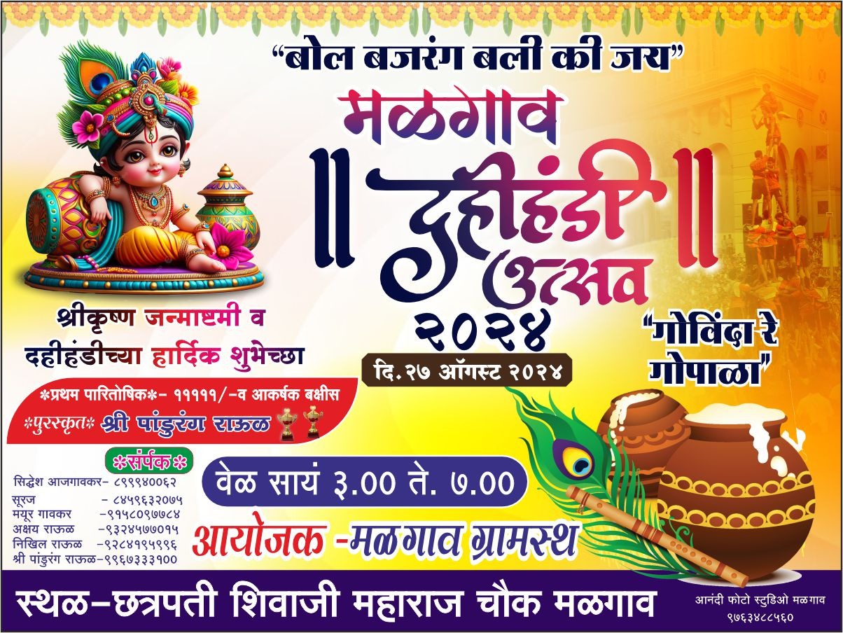 ⚡सावंतवाडी ता.२५ सहदेव राऊळ-: मळगाव ग्रामस्थ व भिल्लवाडी ग्रुप मळगावच्यावतीने २७ ऑगस्ट रोजी सायंकाळी ३ ते ७ या वेळेत मळगाव येथील छत्रपती शिवाजी महाराज चौक येथे भव्य दिव्य दहीहंडी उत्सव २०२४ चे आयोजन करण्यात आले आहे.