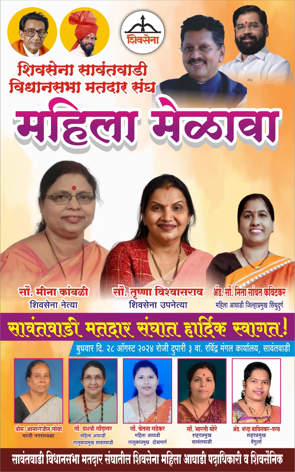 ⚡सावंतवाडी ता.२७-: सावंतवाडी मतदारसंघातील शिवसेना महिला आघाडीचा भव्य मेळावा उद्या रवींद्र मंगल कार्यालय येथे घेण्यात येणार आहे.याबाबतची माहिती शिवसेना महिला जिल्हाप्रमुख अँड. नीता सावंत कवीटकर यांनी दिली. या मेळाव्याला प्रमुख पाहुणे म्हणून शिवसेना उपनेत्या मीनाताई कांबळी यांचे मार्गदर्शन लाभणार आहे तरी जास्तीत जास्त महिला पदाधिकारी व कार्यकर्त्यांनी मोठ्या संख्येने उपस्थित राहावे असे आव्हाने सौ अँड निता सावंत कविटकर यांनी केले आहे.