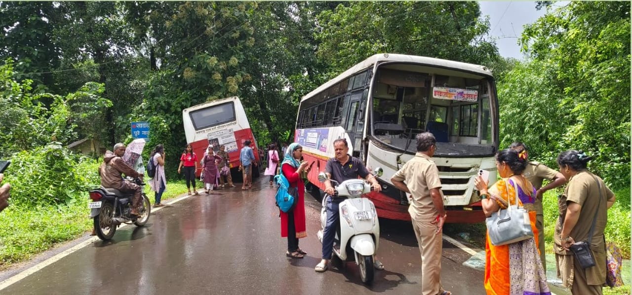 ⚡सावंतवाडी ता.२८-: कोलगाव येथे दोन बस मध्ये अपघात झाला. दुपारी दीडच्या सुमारास ही घटना घडली. सुदैवाने यात मोठी हानी झाली नाही. सावंतवाडीला येणारी व कुडाळ जाणाऱ्या बसमध्ये टक्कर होऊन बसचे मोठ्या प्रमाणात नुकसान झालं. सामाजिक बांधिलकीचे रवी जाधव यांनी घटनास्थळी धाव घेत मदत कार्य केले.