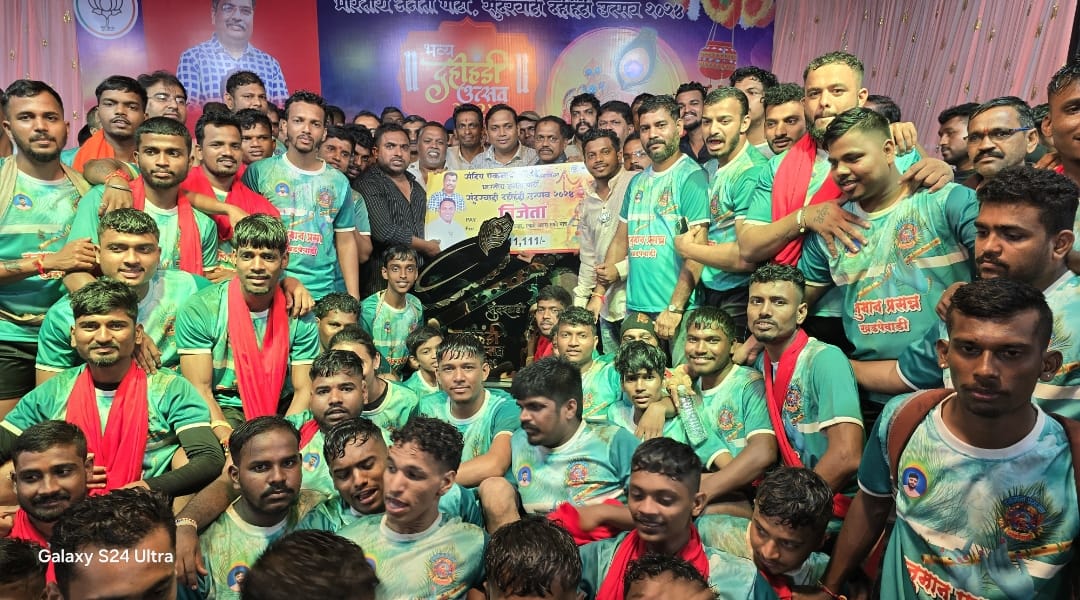 सावंतवाडी । प्रतिनिधी : भाजप नेते संदीप गावडे आयोजित भारतीय जनता पार्टी सुंदरवाडी दहीहंडी उत्सव २०२४ स्पर्धेची रंगत उत्तरोत्तर रात्री अधिकच वाढत गेली. महापुरुष गोविंदा पथक नीमजगा बांदा गोविंदा पथकाने थरारक सात थरांची सलामी दिल्यानंतर हनुमान प्रसन्न राजापूर संघाने त्यांच्याही पेक्षा कमी वेळेत सात थरांची सलामी देत हा संघ सुंदरवाडी दहीहंडी महोत्सवाच्या या स्पर्धेचा मानकरी ठरला. या संघाला संदीप गावडे यांच्या माध्यमातून १ लाख ११ हजार १११ रुपयांचे रोख पारितोषिक व भव्य चषक देऊन सन्मानित करण्यात आले.