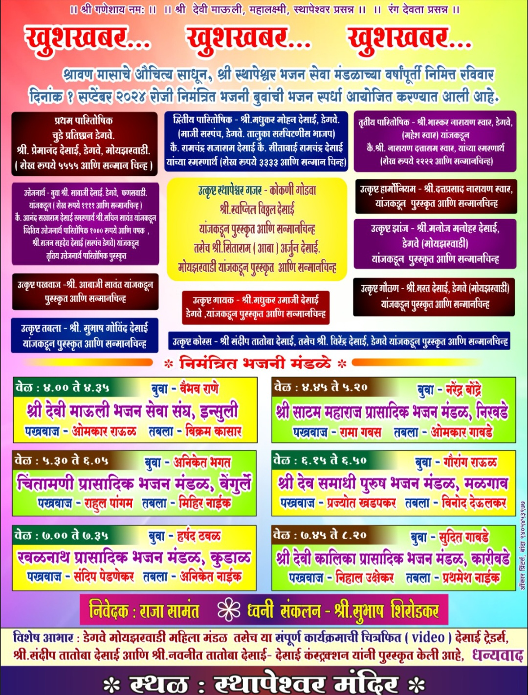 स्पर्धेत श्री माऊली भजन सेवा संघ इन्सुली (बुवा वैभव राणे), चिंतामणी प्रासादिक भजन मंडळ वेंगुर्ले (बुवा अनिकेत भगत), रवळनाथ प्रासादिक भजन मंडळ कुडाळ (बुवा हर्षद ढवळ), श्री साटम महाराज प्रासादिक भजन मंडळ निरवडे (बुवा नरेंद्र बोंद्रे), श्री देव समाधी पुरुष भजन मंडळ मळगाव (बुवा गौरांग राऊळ) आणि श्री देवी कालिका प्रासादिक भजन मंडळ कारीवडे (बुवा सुदित गावडे) ही सहा भजनी मंडळे सहभागी झाली आहेत. ध्वनी संयोजन सुभाष शिरोडकर यांचे असून राजा सामंत यांचे बहारदार निवेदन असेल. भजन प्रेमींनी या स्पर्धेचा लाभ घ्यावा, असे आवाहन श्री स्थापेश्वर भजन सेवा संघ व डेगवे ग्रामस्थांकडून करण्यात आले आहे.