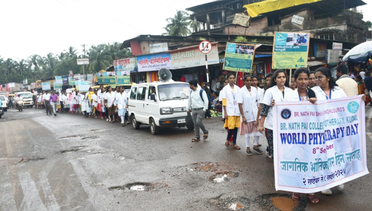 दरवर्षी जगभरामध्ये ८ सप्टेंबर हा दिवस जागतिक भौतिकोपचार दिन म्हणून साजरा केला जातो. या पार्श्वभूमीवर दिनांक 2 सप्टेंबर 2024 पासून 8 सप्टेंबर पर्यंत कुडाळ येथील बॅ. नाथ पै फिजिओथेरपी महाविद्यालयाच्या वतीने कंबरदुखी या थीम संदर्भात डॉ. बाबासाहेब आंबेडकर पुतळ्यापासून ते कुडाळ ग्रामीण रुग्णालयापर्यंत एका जनजागृती रॅलीचे आयोजन करण्यात आलेले होते. तसेच याच महाविद्यालयातील प्रथम वर्षाच्या विद्यार्थ्यांनी कुडाळ एसटी स्टँड समोरील गांधी चौकात, जिजामाता चौकात, ग्रामीण रुग्णालय परिसरात व शिवाजीनगर येथे कंबरदुखी जनजागृती संदर्भात पथनाट्य सादर केले. यामध्ये भविष्यातील सर्जरी टाळण्यासाठी फिजिओथेरपी उपचार पद्धती किती महत्त्वाचे आहे. याचं सर्वांना प्रात्यक्षिकासह आवाहन करण्यात आले.