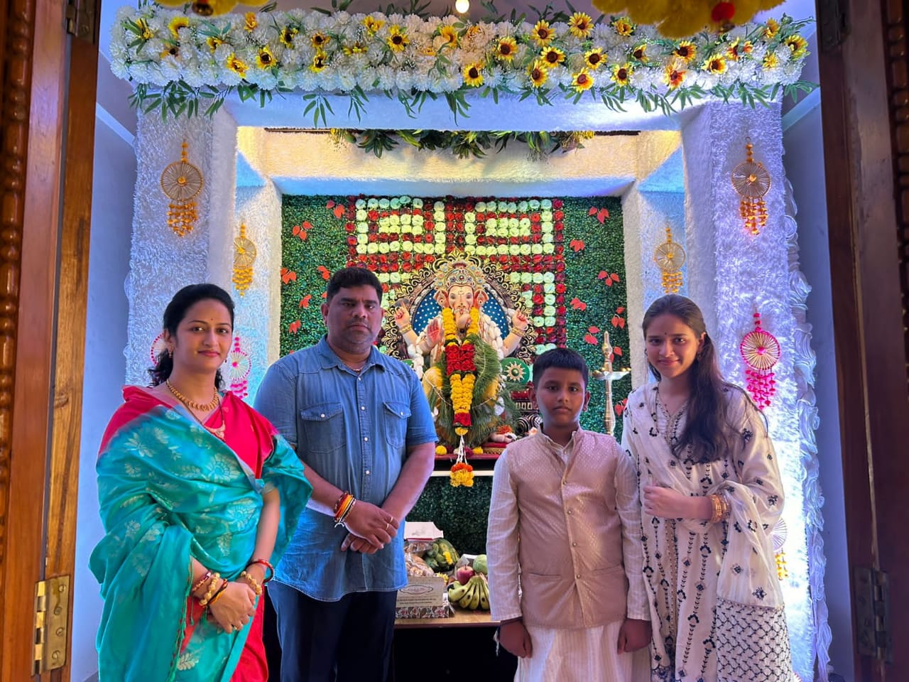 कुडाळ : आमदार वैभव नाईक यांनी कुटुंबीयांसोबत आरोंदा येथील निवासस्थानी विराजमान गणरायाचे दर्शन घेऊन विधिवत पूजा केली. सर्व गणेशभक्तांच्या सुखसमृद्धीची कामना त्यांनी गणपती बाप्पांकडे केली.