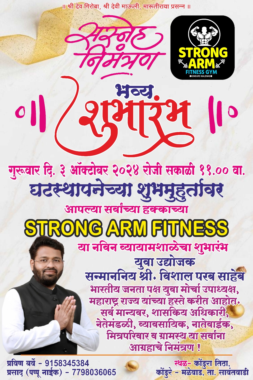 ⚡सावंतवाडी ता.०२-: घटस्थापनेच्या शुभमुहूर्तावर सावंतवाडी तालुक्यातील मळेवाड-कोंडुरा तिठा येथे नव्याने उभारण्यात आलेल्या “स्ट्राँग आर्म फिटनेस” या आधुनिक व्यायामशाळेचे उद्घाटन गुरुवार दि. ३ ऑक्टोबर २०२४ रोजी सकाळी ११ वाजता युवा उद्योजक तथा भारतीय जनता युवा मोर्चाचे उपाध्यक्ष श्री.विशाल परब यांच्या शुभहस्ते होणार आहे.