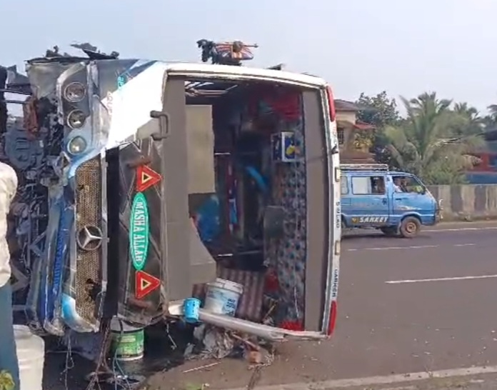 कणकवली : मुंबई – गोवा महामार्गावर जाणवली तरंदळे फाटा येथील ओव्हर ब्रिजवर मुंबईहून गोव्याच्या दिशेने जाणारा कंटेनर क्रमांक ( KA २० AC ०४५९ ) साधारणपणे दुभाजकाच्या कठड्याला धडकला. धडकल्यांनातर पलीकडच्या लेनवरून मूळ लेनवर साधारणपणे वीस फूट अंतरावर पलटी झाला. मात्र हा अपघात महामार्गांवरील इतर अपघातांपेक्षा काहीसा वेगळा होता. अपघात नेमका कसा झाला हे समजलेच नाही. कंटेनर धडकल्यानंतर कंटेनर चे काही पार्ट हे दुभाजकाच्या मधील भागातून सर्विस रस्त्यावर पडले तर काही पार्ट हे महामार्गावरच होते. सदर कंटेनर ची पाहणी केली असता कंटेनरमध्ये मच्छी असल्याचे दिसून आले.