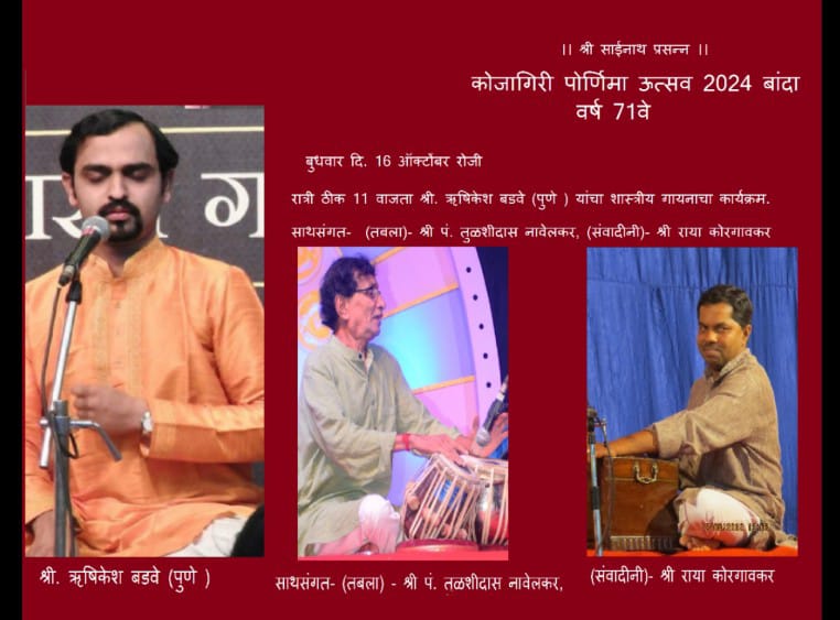 दुसऱ्या सत्रात रात्री ११ वा. ऋषिकेश बडवे (पुणे) यांचा शास्त्रीय गायनाचा कार्यक्रम होईल. त्यांना तबला साथ पं. तुळशीदास नावेलकर आणि संवादीनी साथसंगत राया कोरगावकर हे करतील. तिसऱ्या सत्रात गोव्यातील गायक ओंकार चारी यांचा उपशास्त्रीय गायनाचा कार्यक्रम होणार आहे. त्यांना साथसंगत तबला साथ संकेत खलप आणि संवादिनी साथसंगत सुनाद कोरगावकर हे करतील. साई भक्त व संगीत प्रेमींनी कार्यक्रमाचा लाभ घ्यावा, असे आवाहन काणेकर कुटुंबीयांकडून करण्यात आले आहे.