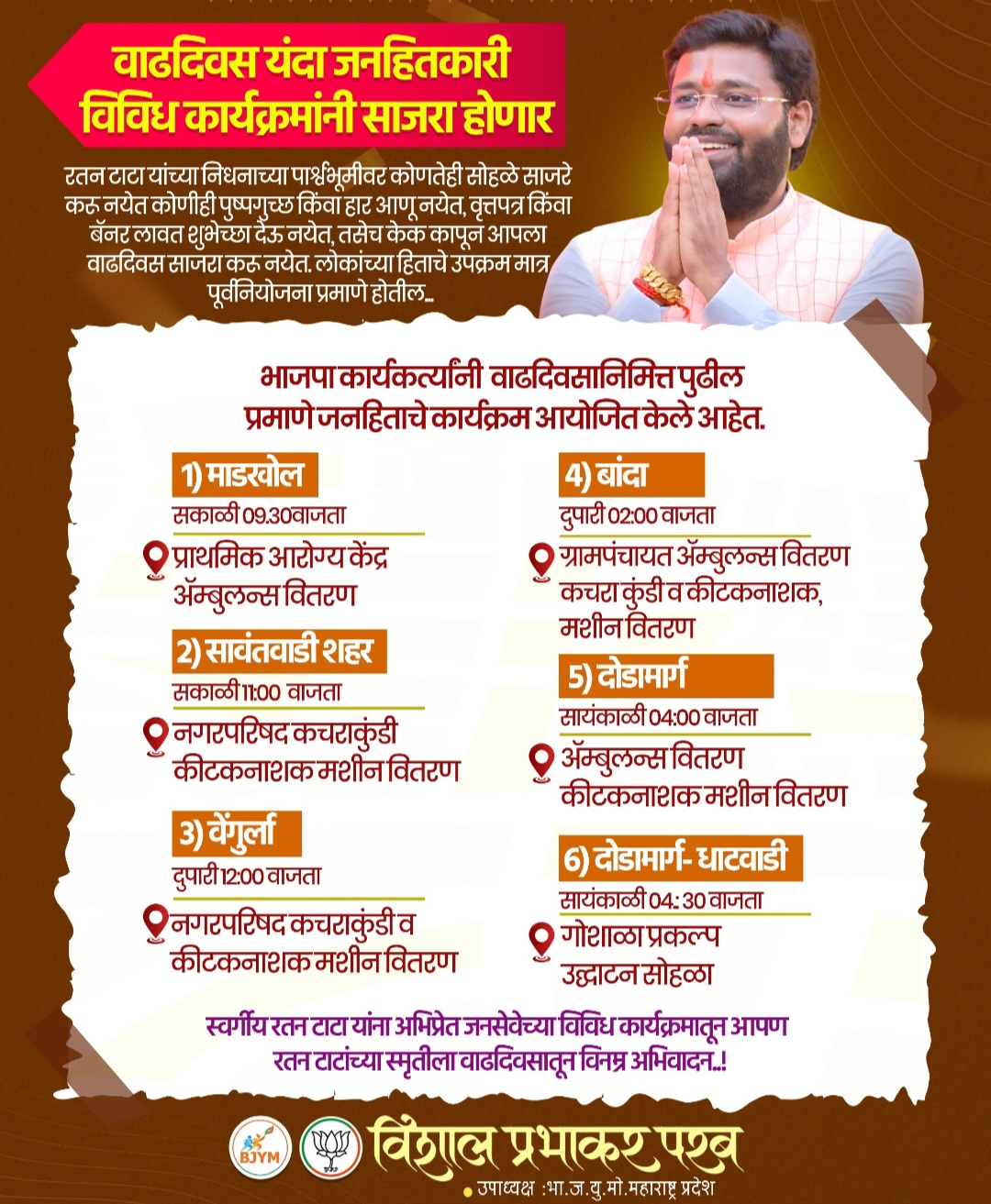 ⚡सावंतवाडी ता.१४-: भाजप युवा मोर्चा महाराष्ट्र प्रदेश उपाध्यक्ष विशाल परब यांचा वाढदिवस यंदा जनहितकारी विविध कार्यक्रमांनी साजरा होणार असल्याची माहिती देण्यात आली असून, माडखोल प्राथमिक आरोग्य केंद्राला ॲम्बुलन्स वितरण करणे, सावंतवाडी शहरात कचराकुंडी कीटकनाशक मशीन वितरण करणे, वेंगुर्ला नगरपरिषद कचराकुंडी व कीटकनाशक मशीन वितरण, बांदा ग्रामपंचायत ॲम्बुलन्स वितरण कचरा कुंडी व कीटक नाशक मशीन वितरण, दोडामार्ग ॲम्बुलन्स वितरण कीटक नाशक मशीन वितरण, दोडामार्ग धाटवाडी येथे गोशाळा प्रकल्प सोहळ्याचे उद्घाटन अशा विविध उपक्रम राबवून विशाल परब यांचा वाढदिवस साजरा होणारा असल्याची माहिती देण्यात आली आहे.