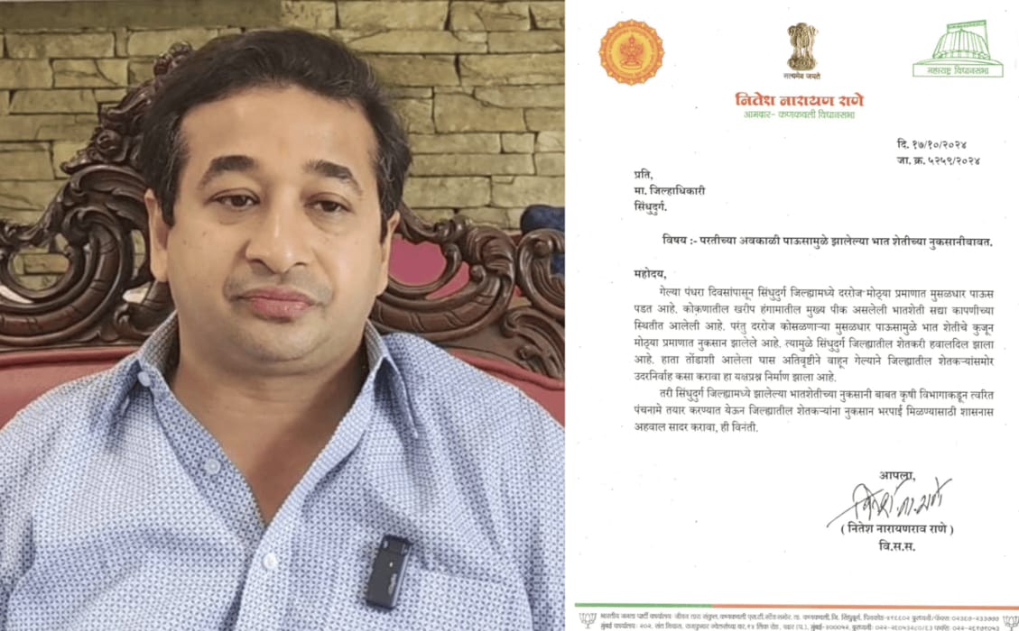 कणकवली : गेल्या पंधरा दिवसांपासून सिंधुदुर्ग जिल्ह्यामध्ये दररोज मोठ्या प्रमाणात मुसळधार पाऊस पडत आहे. कोकणातील खरीप हंगामातील मुख्य पीक असलेली भातशेती सद्या कापणीच्या स्थितीत आलेली आहे. परंतु दररोज कोसळणाऱ्या मुसळधार पाऊसामुळे भात शेतीचे कुजून मोठ्या प्रमाणात नुकसान झालेले आहे. त्यामुळे सिंधुदुर्ग जिल्ह्यातील शेतकरी हवालदिल झाला आहे. हाता तोंडाशी आलेला घास अतिवृष्टीने वाहून गेल्याने जिल्ह्यातील शेतकऱ्यांसमोर उदरनिर्वाह कसा करावा हा यक्षप्रश्न निर्माण झाला आहे. त्यामुळे सिंधुदुर्ग जिल्ह्यामध्ये झालेल्या भात शेतीच्या नुकसानी बाबत कृषी विभागाकडून त्वरित पंचनामे तयार करण्यात येऊन जिल्ह्यातील शेतकऱ्यांना नुकसान भरपाई मिळण्यासाठी शासनास अहवाल सादर करावा, असे पत्र आमदार नितेश राणे यांनी सिंधुदुर्ग जिल्हाधिकारी यांना दिले आहे.