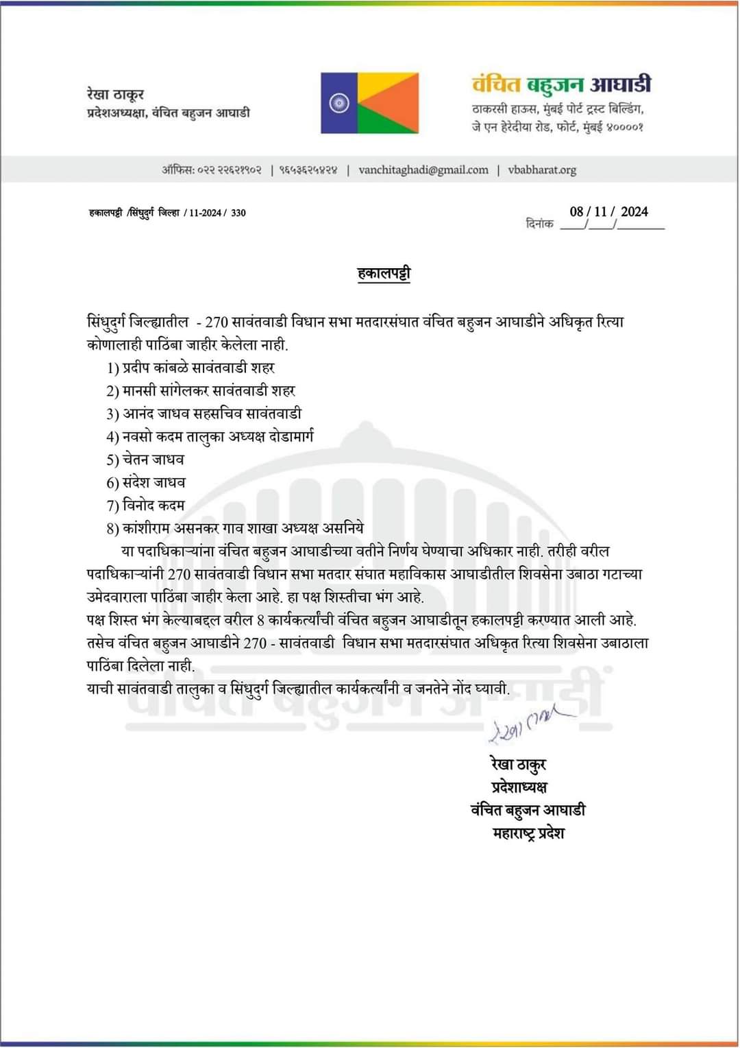 सावंतवाडी विधानसभा मतदारसंघात महाविकास आघाडीतील शिवसेना उबाठा गटाच्या राजन तेली यांना त्यांनी पाठिंबा जाहीर केला आहे. हा पक्षाच्या शिस्तीचा भंग असून शिस्तबंग केल्याबद्दल या आठ कार्यकर्त्यांची वंचित बहुजन आघाडीकडून हकालपट्टी करण्यात आल्याचे पत्र प्राप्त झाले आहे.