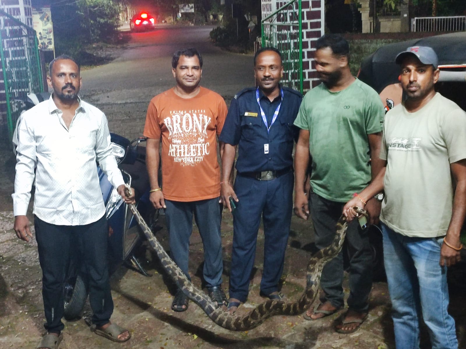 सावंतवाडी : उपजिल्हा रुग्णालयाच्या समोर तलावाजवळ हा दहा फुटी अजगर सापडला असून त्यामध्ये सामाजिक कार्यकर्ते राजू धारपवार, बाबू तेली, भूषण नाईक, महेश नाईक, प्रलाद केतकर यांनी हा अजगर पकडून वनविभागाकडे सुपुर्द केला. यासाठी जीवनरक्षा वैद्यकीय प्रतिष्ठानचे अध्यक्ष राजेंद्र मसुरकर यांनी सर्व कार्यकर्त्यांचे आभार मानले आहे.