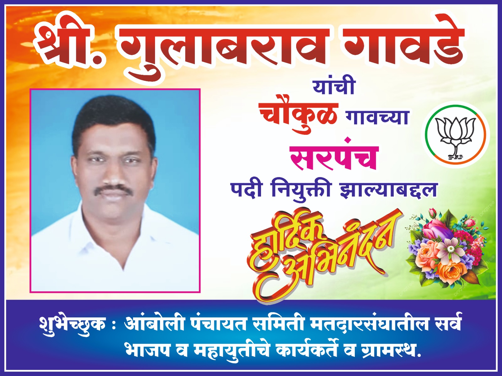 ⚡आंबोली ता.१२-: चौकुळ गावच्या सरपंच पदी गुलाबराव गावडे यांची नियुक्ती करण्यात आली आहे. त्यांच्या या नियुक्ती बद्दल सर्व स्तरातून अभिनंदन होत आहे.दरम्यान आंबोली पंचायत समिती मतदारसंघातील महायुतीच्या पदाधिकारी, कार्यकर्त्यांनी त्यांचे अभिनंदन केले असून सरपंच पदाच्या कार्यकाळासाठी शुभेच्छा दिल्या आहेत.