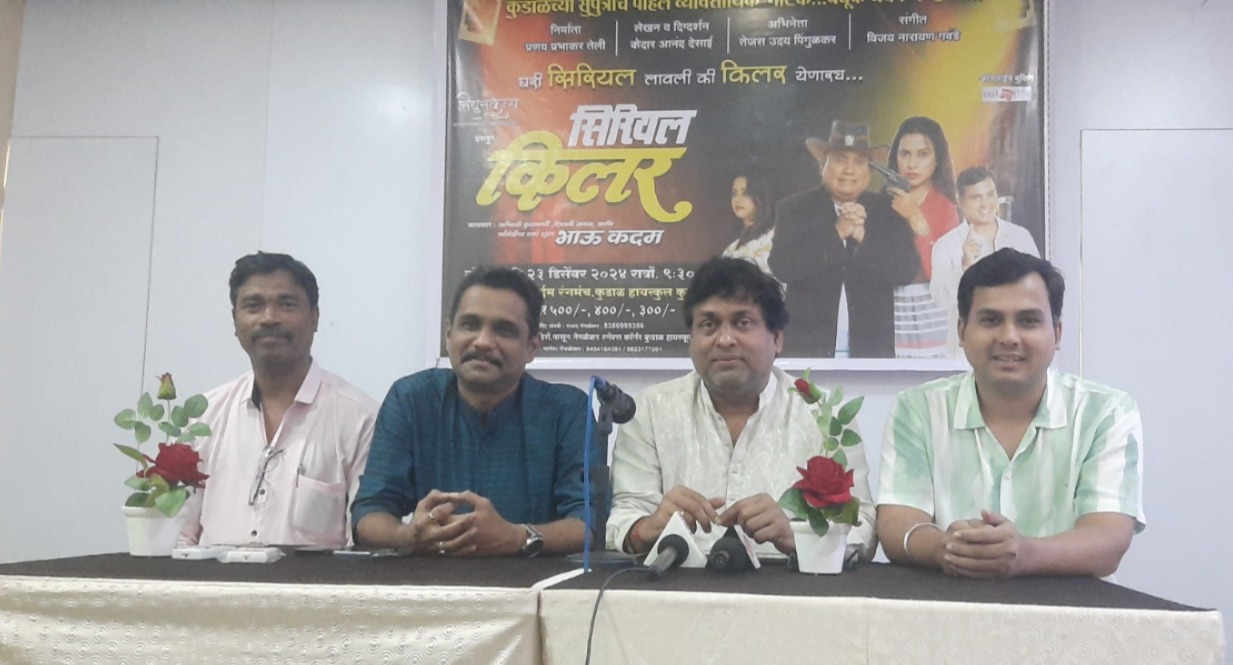 ⚡कुडाळ ता.२०-: सिंधुसंकल्प निर्मित ‘सिरीयल किलर’ हे नाटक सिंधुदुर्गच्या दौऱ्यावर येत आहे. 23 डिसेंबरला कुडाळ मध्ये तर 24 डिसेंबरला मालवण मध्ये या नाटकाचे प्रयोग होणार आहेत. विशेष म्हणजे विनोदी अभिनेते भाऊ कदम यांच्यासह या नाटकाचे निर्माते प्रणय तेली, लेखक आणि दिग्दर्शक केदार देसाई, कलाकार तेजस पिंगुळकर, रुपाली जाधव हे सारे सिंधुदुर्ग जिल्ह्यातील आहेत. सिंधुदुर्ग जिल्ह्यातील या साऱ्या रंगकर्मींनी एकत्र येत केलेला हा नाट्यप्रयोग सर्वानी पाहावा असे आवाहन नाटकाचे निर्माते प्रणय तेली, लेखक दिग्दर्शक केदार देसाई, कलाकार तेजस पिंगुळकर आणि सिंधू संकल्प संस्थेचे सचिव भूषण तेजम यांनी केले आहे. कुडाळ येथे ते पत्रकार परिषदेत बोलत होते.