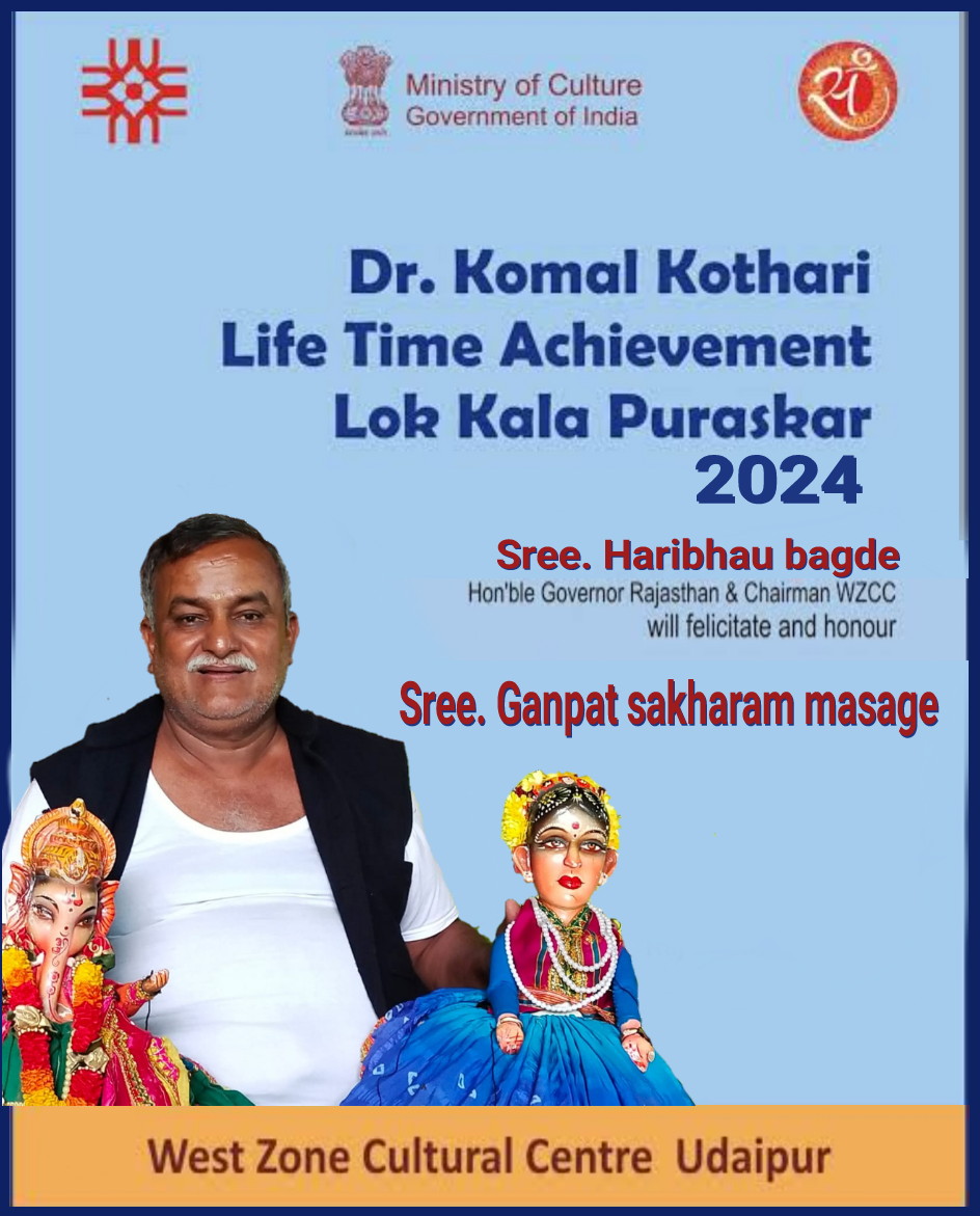 कुडाळ : ठाकर आदिवासी कलाक्षेत्रातील कळसूत्री बाहुल्या व चित्रकथी या कलाप्रकारात उल्लेखनीय कार्य केल्याबद्दल राष्ट्रीय लोककलाकार गणपत सखाराम मसगे यांना राजस्थान सरकार व पश्चिम क्षेत्र सांस्कृतिक उदयपूर यांच्याकडून दिला जाणारा लाइफटाइम अचीवमेंट कोमल कोठारी पुरस्कार जाहीर करण्यात आला आहे. उदयपूर येथे होणाऱ्या शिल्पग्राम महोत्सवामध्ये या पुरस्काराचे वितरण आज २१ डिसेंबर रोजी करण्यात येणार आहे.