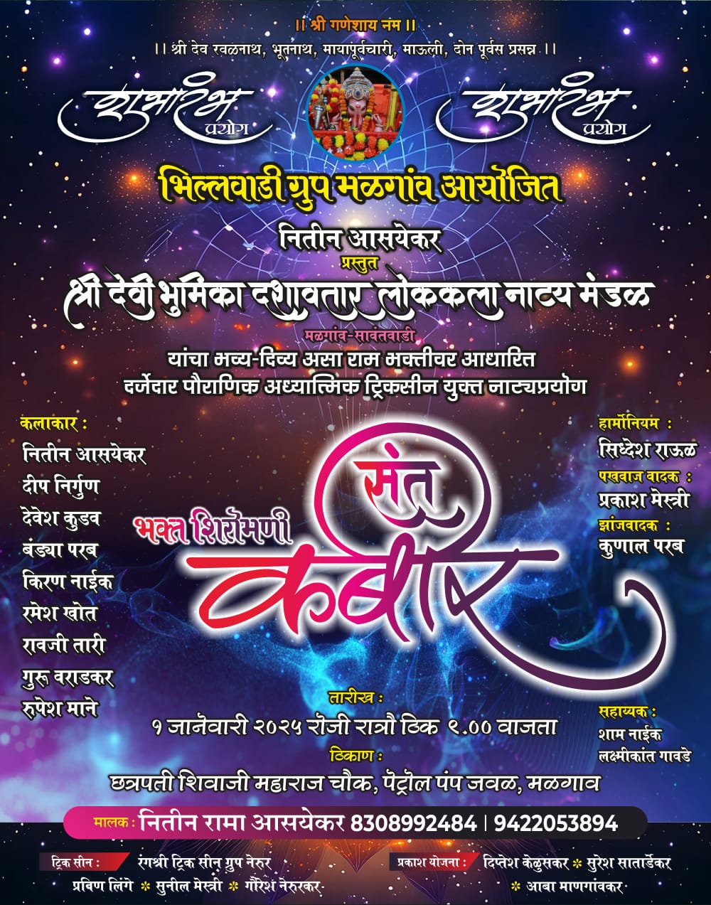 ⚡सावंतवाडी ता.२२-: भिल्लवाडी गृप मळगाव आयोजित सिंधुदुर्गातील प्रसिद्ध दशावतार कलाकार नितिन आसयेकर प्रस्तुत श्री देवी भुमिका दशावतार लोककला नाट्य मंडळ यांचा भव्य-दिव्य असा राम भक्तीवर आधारित दर्जेदार पौराणिक अध्यात्मिक ट्रिक्सीन युक्त नाट्यप्रयोग “भक्त शिरोमणी संत कबीर” चे आयोजन १ जानेवारी २०२५ रोजी राञौ ठिक ९ वाजता मळगाव येथील छञपती शिवाजी महाराज चौक येथे करण्यात आले आहे.