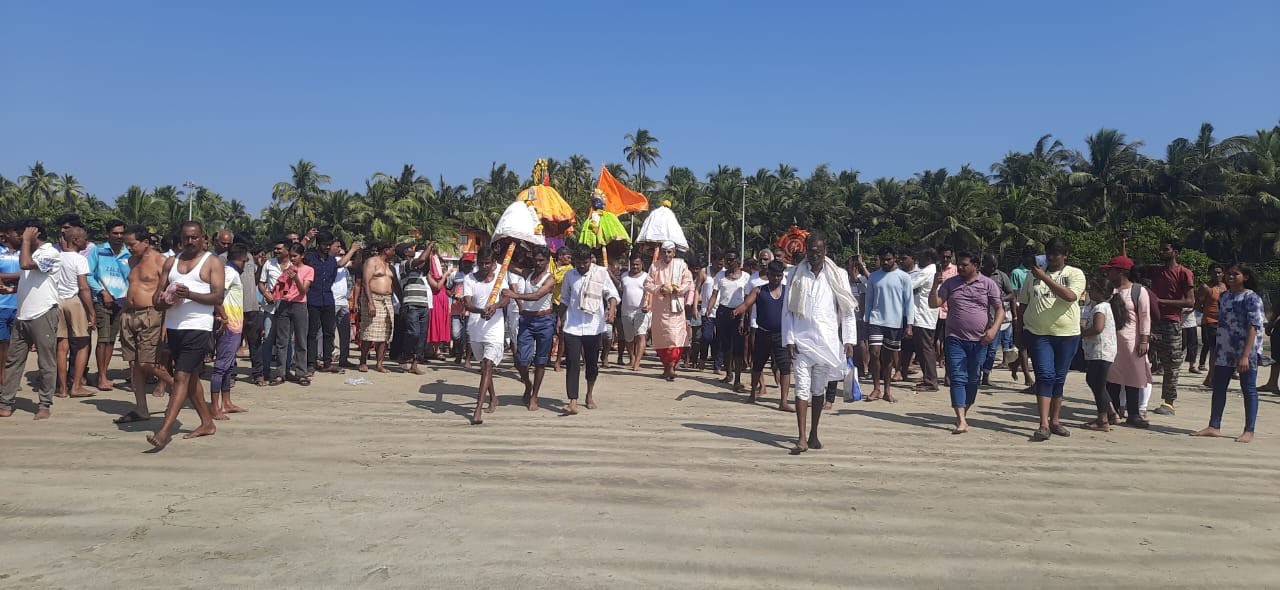 फोटो ओळ:- मालवण: सोमवती अमावस्या निमित्त आंबडोस गावची ग्रामदेवता श्री देव रवळनाथ पंचायतन सह मोरयाचा धोंडा येथील समुद्रात तीर्थ स्नानासाठी जात असताना.