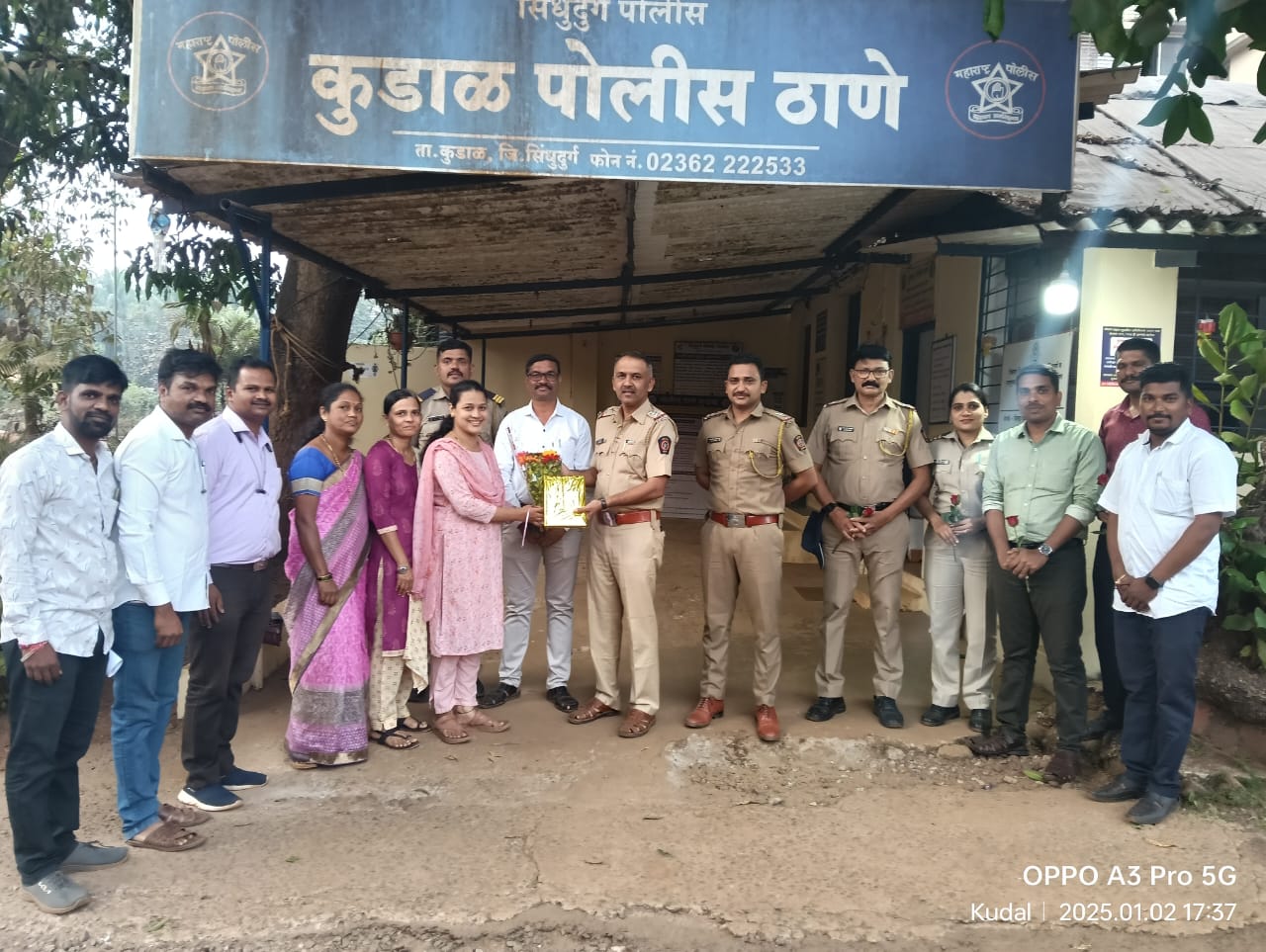 ⚡कुडाळ ता.०५-: पोलिस पाटील सेवा संघ सिंधुदुर्ग यांच्याकडून महाराष्ट्र पोलीस वर्धापन दिनाच्या निमित्ताने पोलिसांना शुभेच्छा देण्यात आल्या. पोलिस पाटील सेवा संघ सिंधुदुर्ग पदाधिकाऱ्यांनी कुडाळ पोलीस ठाण्यामध्ये जाऊन या शुभेच्छा दिल्या. यावेळी जिल्हा सचिव सतिश माडये, तालुका अध्यक्ष वैभव धुरी, सुरेश नाईक, सौ.सुवर्णा म्हाडदळकर,सौ. स्नेहा मुंगारे,सौ.सदफ खूल्ली, सुरजित गावडे तसेच पोलीस निरीक्षक राजेंद्र मगदूम, गणेश कऱ्हाडकर, संजय कदम, सारिका बांदेकर,.प्रीतम कदम, रुपेश सारंग, श्री. झारापकर, सौ.रेडकर आदी उपस्थित होते.