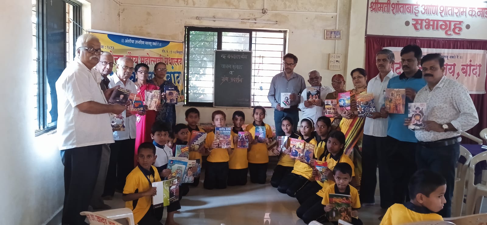बांदा नट वाचनालयात आयोजित ग्रंथ प्रदर्शनास उपस्थित असलेले मान्यवर व विद्यार्थी.