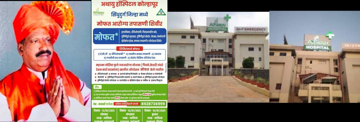 ⚡सावंतवाडी ता.०७-: अथायु हॉस्पिटल कोल्हापूर व सिंधुदुर्ग विविध उपजिल्हा रुग्णालय यांच्यावतीने मोफत आरोग्य तपासणी व ऑपरेशन शिबीर दिनांक १३ जानेवारी ते १५ जानेवारी अनुक्रमे कणकवली, सावंतवाडी, शिरोडा ह्या उपजिल्हा रुग्णालयांध्ये सकाळी ११ ते २ ह्या वेळेत आयोजित केले आहे.