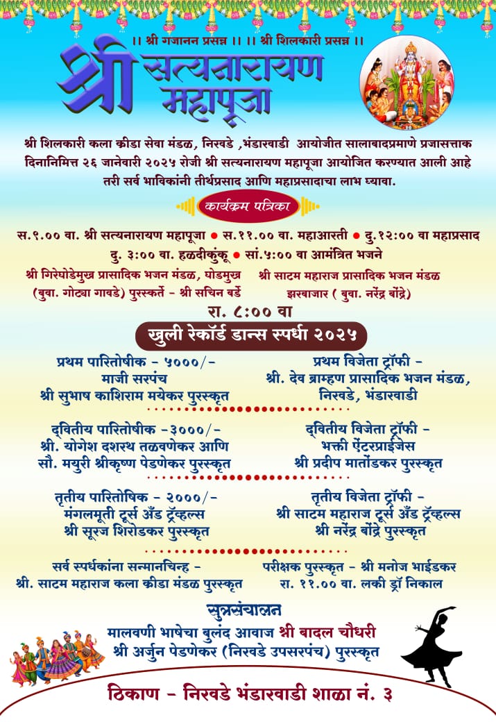 ⚡सावंतवाडी ता.१६-: श्री शिलकारी कला क्रिडा सेवा मंडळ निरवडे, भंडारवाडी आयोजित शाळा नं. ३ येथे सत्यनारायण महापूजेनिमित्त २६ जानेवारी रोजी रात्री ८. वाजता जिल्हास्तरीय रेकॉर्ड डान्स स्पर्धेचे आयोजन करण्यात आले आहे.