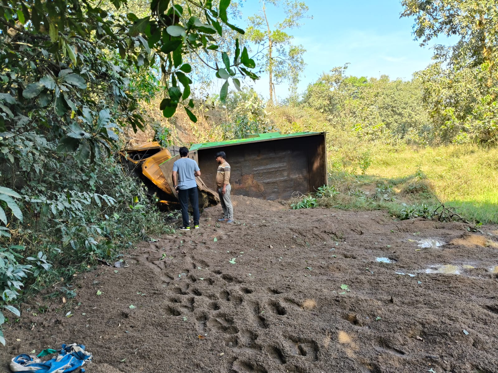 हा अपघात गुरुवारी मध्यरात्री मुंबई गोवा महामार्गवरील येथे घडला.सुदैवाने कोणतीही जीवितहानी झाली नाही. मात्र डंपरचे फार मोठे नुकसान तर डंपरमधील वाळूचे नुकसान झाले. याबाबतची कोणतीच नोंद पोलिसात नव्हती.