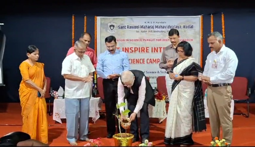 कुडाळ : कुडाळच्या संत राऊळ महाराज महाविद्यालयात आज डिस्ट्रिक्ट इन्स्पायर कॅम्पला सुरुवात झाली. भारत सरकारच्या विज्ञान आणि तंत्रज्ञान विभागाच्या वतीने आणि संत राऊळ महाराज महाविद्यालय आणि विद्यानिकेतन कॉन्व्हेंट स्कुल कसाल यांच्या संयुक्त विद्यमाने ५ दिवस चालणाऱ्या या निवासी कॅम्पचं उदघाटन सिंधुदुर्गचे जिल्हाधिकारी अनिल पाटील आणि उपस्थित मान्यवर यांच्या हस्ते वडाच्या रोपट्याला जलदान करून झालं. या कॅम्पमध्ये इयत्ता अकरावी विज्ञान शाखेचे आणि दहावीच्या परीक्षेत ९४ टक्के पेक्षा जास्त गुण मिळवलेले २०० विद्यार्थी सहभागी झाले आहेत. सिंधुदुर्गसह राज्याच्या ९ जिल्ह्यातल्या ३७ शाळेतले हे विद्यार्थी आहेत.