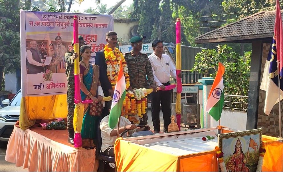 नुकत्याच दिल्ली येथे झालेल्या प्रजासत्ताक दिन संचलनासाठी सिंधुदुर्ग जिल्ह्यातून एकमेव निवड झालेला आणि महाराष्ट्राचे प्रतिनिधित्व केलेला मालवण येथील स. का. पाटील सिंधुदुर्ग महाविद्यालयाचा एनसीसी विभागाचा विद्यार्थी राहुल चव्हाण याचे आज दिल्लीहून मालवणात आगमन झाल्यानंतर मालवण शहरातून त्याची भव्य गौरव रॅली काढण्यात आली. राहुल याने आपल्या कामगिरीने मालवणसह सिंधुदुर्ग जिल्ह्याची मान उंचावली असून याबद्दल राहुल याचा सार्थ अभिमान असल्याचे कौतुकोद्गार यावेळी उपस्थित समस्त मालवणवासियांनी काढत राहुल याचे जंगी स्वागत केले.