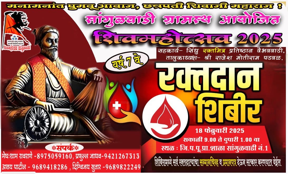 ⚡वैभववाडी ता.१८-: सांगुळवाडी ग्रामस्थ आयोजित शिव महोत्सव सांगळवाडी त्या महोत्सवाचे हे सातवे वर्ष असून सालाबाद प्रमाणे याही वर्षी शिव महोत्सव सांगळवाडी 2025 निमित्त सामाजिक बांधिलकी जपत 18 फेब्रुवारी 2025 रोजी महा रक्तदान शिबिर तर 19 फेब्रुवारी 2025 रोजी विविध कार्यक्रमाचे आयोजन करण्यात आलेले आहे तरी तालुक्यातील शिवप्रेमींनी उपस्थित राहावे असे आव्हान सांगुळवाडी ग्रामसच्या वतीने करण्यात आले आहे