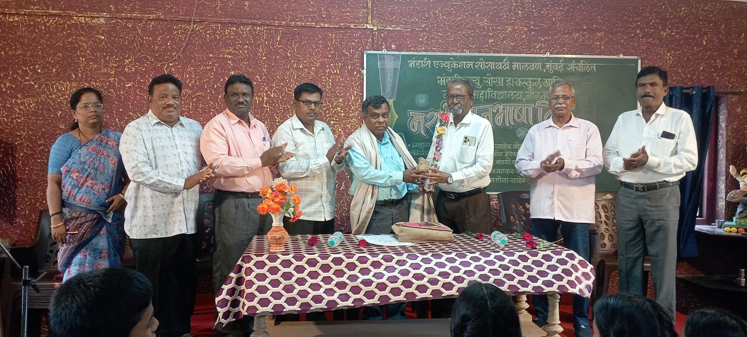 मालवण येथील भंडारी एज्युकेशन सोसायटी हायस्कूलमध्ये मराठी राजभाषा दिन साजरा करण्यात आला त्यावेळी प्रा भाऊसाहेब गोसावी हे बोलत होते यावेळी व्यासपीठावर कार्यक्रमाचे अध्यक्ष संस्थेचे चेअरमन श्री सुधीर हेरेकर, संस्थेचे लोकल कमिटीचे खजिनदार श्री जॉन नरोन्हा सेक्रेटरी श्री दशरथ कवठकर मुख्याध्यापक एच बी तिवले, पर्यवेक्षक आर डी बनसोडे, सौ अस्मिता वाईरकर ग्रंथपाल प्रफुल्ल देसाई कु पूजा कुडाळकर आदी उपस्थित होते