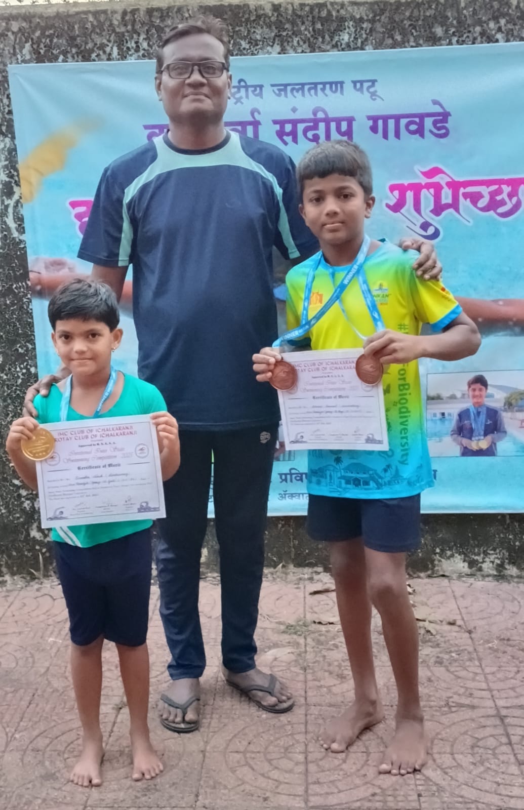 फोटो ओळ: इचलकरंजी: विजेते स्पर्धक लीनांशा आणि अथर्व यांच्या सोबत प्रशिक्षक प्रवीण सुलोकार