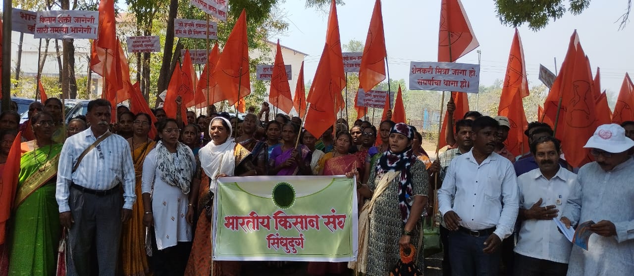 आमची मागणी मान्य करा -तुमचे प्राणी घेऊन चला, वन्य प्राण्यांचे करायचं काय- खाली डोके वर पाय, भारत माता की जय, शेतकऱ्या जागा हो संघर्षाचा धागा हो, आदि गगनभेदी घोषणांनी सिंधुदुर्गनगरी दणाणून सोडत भारतीय किसान संघाच्या वतीने जिल्हाधिकारी कार्यालयावर मोर्चा काढण्यात आला. या मोर्चाच्या माध्यमातून वन्य प्राण्यांमुळे जिल्ह्यातील शेतकऱ्यांचे होणारे नुकसान थांबवावे अशी विनंती करणारे निवेदन मुख्यमंत्र्यांना देण्यासाठी जिल्हाधिकाऱ्यांना देण्यात आले. यावेळी भारतीय किसान संघाचे जिल्हाध्यक्ष तानाजी सावंत, जिल्हा मंत्री अभय भिडे, उपाध्यक्ष सूर्यकांत कुंभार, कोषाध्यक्ष रामकृष्ण पंतवालावलकर, महिला प्रमुख स्वाती पिंगुळकर, कुडाळ तालुकाध्यक्ष जयराम परब, सावंतवाडी तालुका अध्यक्ष पांडुरंग हळदणकर, वेंगुर्ला तालुका अध्यक्ष युवराज ठाकूर, जिल्हा कार्यकारणी सदस्य श्रीकृष्ण धुरी, विश्वास सावंत, भूषण बांबार्डेकर, प्रांत प्रतिनिधी प्रमोद लांगी यांच्यासह मोठ्या संख्येने जिल्ह्यातील शेतकरी या मोर्चात सहभागी झाले होते.