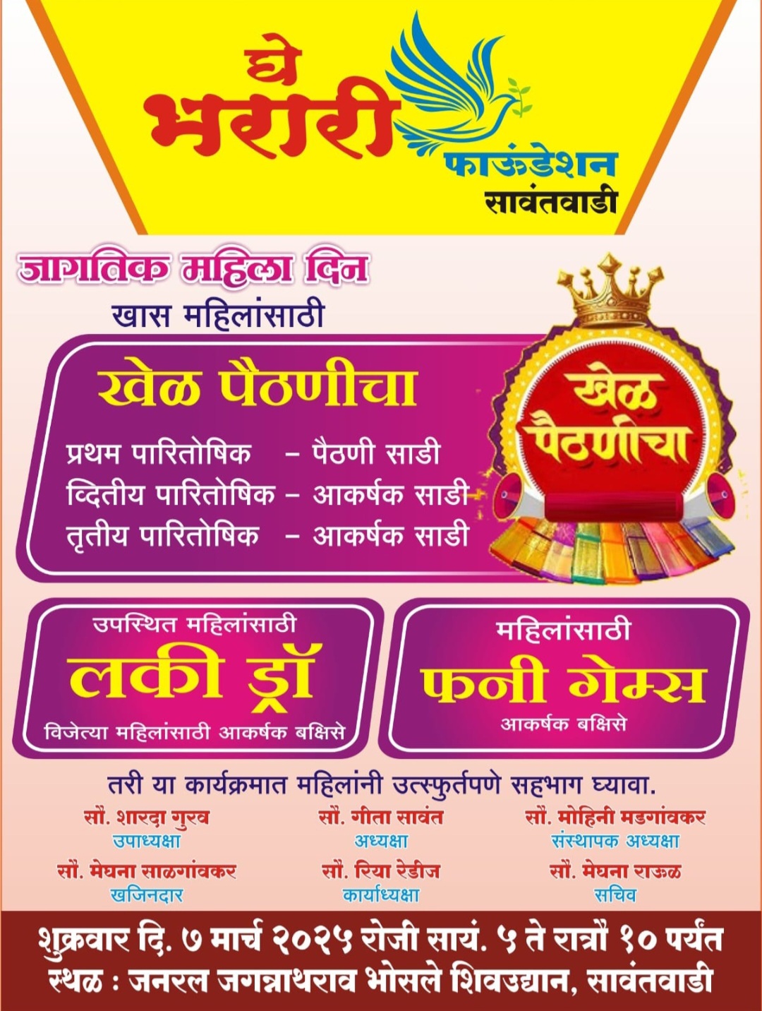 ⚡सावंतवाडी ता.०६-: घे भरारी फाउंडेशन सावंतवाडीतर्फे जागतिक महिला दिनाच्या निमित्ताने खास महिलांसाठी खेळ पैठणीचा या कार्यक्रमाच आयोजन करण्यात आले आहे. जनरल जगन्नाथराव भोसले शिव उद्यान येथे उद्या ७ मार्च रोजी सायं. ५ वा. या सोहळ्याचे आयोजन करण्यात आले आहे.