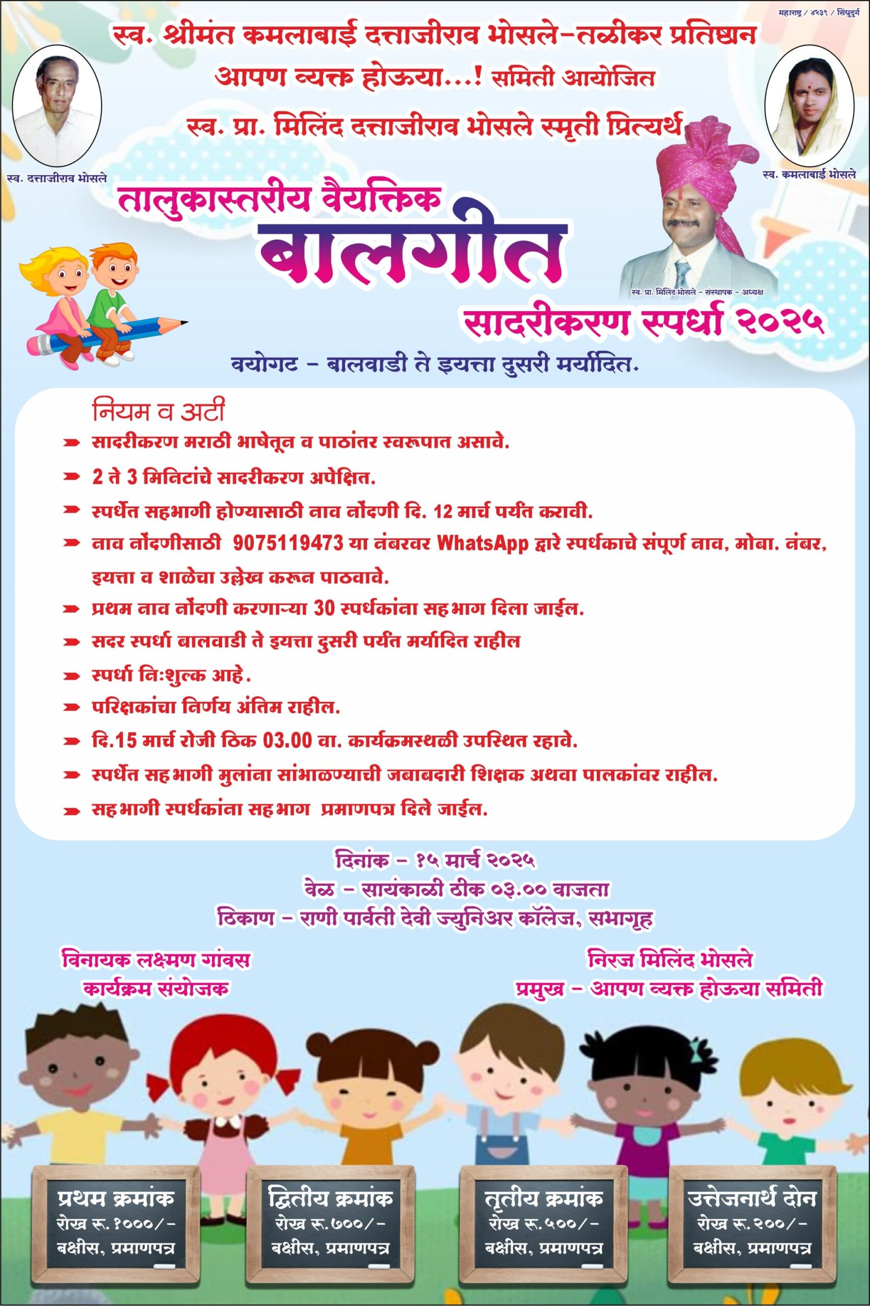 बालवाडी ते दुसरी इयत्तेतील चिमुकल्यांसाठी ही स्पर्धा आयोजित करण्यात आली आहे.दिनांक १५ मार्च २०२५ रोजी सायंकाळी ठीक ०३.०० वा. राणी पार्वती देवी ज्युनिअर कॉलेज, सभागृहात ही स्पर्धा आयोजित करण्यात आली आहे. प्रथम नाव नोंदणी करणाऱ्या 30 स्पर्धकांना सहभाग दिला जाणार आहे. 2 ते 3 मिनिटांचे सादरीकरण अपेक्षित असून स्पर्धेत सहभागी होण्यासाठी नाव नोंदणी दि. 12 मार्च पर्यंत करायची आहे. नाव नोंदणीसाठी 9075119473 या नंबरवर WhatsApp द्वारे स्पर्धकाचे संपूर्ण नाव, मोबा. नंबर, इयत्ता व शाळेचा उल्लेख करून पाठवायचा आहे. बालगीत सादरीकरण हे मराठी भाषेतून व पाठांतर स्वरूपात असावे. ही स्पर्धा बालवाडी ते इयत्ता दुसरी पर्यंत मर्यादित असून निःशुल्क आहे.परिक्षकांचा निर्णय अंतिम राहणार असून 15 मार्च रोजी ठिक 3.00 वा. स्पर्धेच्या ठिकाणी उपस्थित रहावे असे आवाहन आयोजकांनी केले आहे. स्पर्धेत प्रथम क्रमांक पटकाविणाऱ्या स्पर्धकास रोख रक्कम १ हजार सन्मानचिन्ह, प्रमाणपत्र, द्वितीय क्रमांकास रोख ७०० रू. सन्मानचिन्ह, प्रमाणपत्र, तृतीय क्रमांकास ५०० रू. सन्मानचिन्ह व प्रमाणपत्र तसेच उत्तेजनार्थ दोन प्रत्येकी २०० रू. सन्मानचिन्ह व प्रमाणपत्र व सहभागी स्पर्धकांना सहभाग प्रमाणपत्र दिले जाईल, तर बक्षीस वितरण समारंभ याच दिवशी संपन्न होईल. तसेच प्रतिष्ठानचे संस्थापक अध्यक्ष स्व. प्रा. मिलिंद भोसले यांच्या स्मृतींना अभिवादन करण्यात येणार असून सचिव स्व. सुभानराव दत्ताजीराव भोसले यांच्या स्मृती प्रित्यर्थ सामाजिक, शैक्षणिक सेवा सन्मान देऊन शिक्षण प्रसारक मंडळ, सावंतवाडीचे सचिव, माजी प्राचार्य व्ही. बी. नाईक यांचा गौरव करण्यात येणार आहे, अशी माहिती प्रतिष्ठानचे संचालक गौरव भोसले, विश्वस्त अनिल भोसले यांनी दिली आहे. या स्पर्धेमध्ये पहिल्या ३० जणांना प्राधान्य असल्याने स्पर्धकांनी नाव नोंदणी लवकरात लवकर करावी असं आवाहन आपण व्यक्त होऊया समिती प्रमुख निरज भोसले, कार्यक्रम संयोजक विनायक गांवस यांनी केलं आहे.