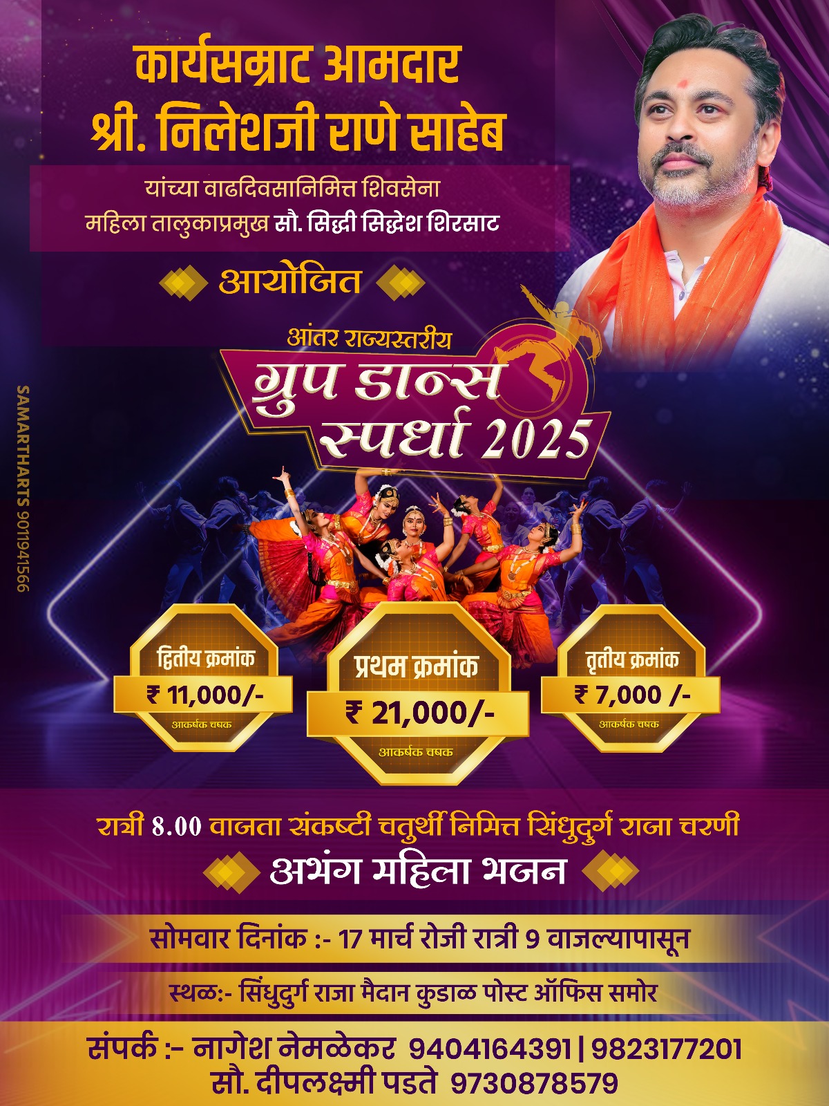 ⚡कुडाळ ता.१४-: आमदार निलेश राणे यांच्या वाढदिवसानिमित्त सोमवार दि. १७ मार्च रोजी शिवसेना महिला तालुका प्रमुख सिद्धी शिरसाट आयोजित भव्य आंतरराज्यस्तरीय गृप डान्स स्पर्धा 2025 चे आयोजन करण्यात आले आहे. कुडाळ येथिल पोस्ट कार्यालयासमोर सिंधुराजा पटांगणावर रात्री 9 वाजता ही स्पर्धा सुरू होणार आहे.