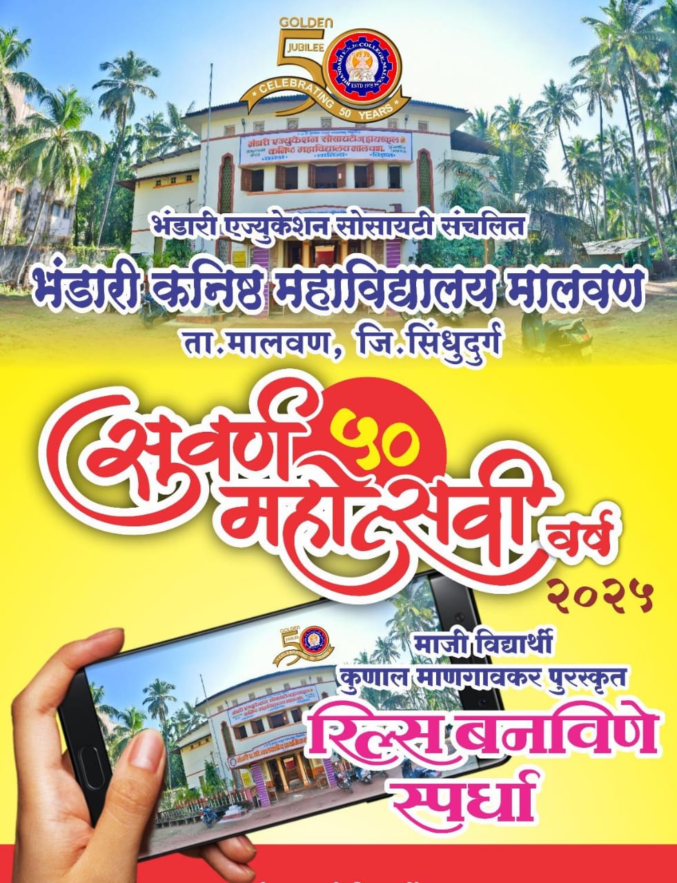 भंडारी एज्युकेशन सोसायटी संचलित भंडारी ए. सो. कनिष्ठ महाविद्यालय मालवण च्या सुवर्णमहोत्सवी वर्षानिमित्त भंडारी कनिष्ठ महाविद्यालय व माजी विद्यार्थी आयोजित आणि कुणाल माणगांवकर पुरस्कृत रील्स स्पर्धेचे आयोजन करण्यात आले आहे.