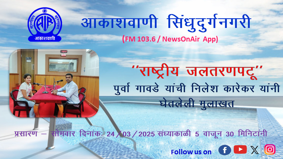⚡सिंधुदुर्गनगरी ता.२३-: सिंधुदुर्गनगरी-ओरोस येथील राष्ट्रीय जलतरणपट्टू पूर्वा संदीप गावडे हिची मुलाखत सोमवार दिनांक २४ मार्च रोजी सायंकाळी ५.३० वाजता सिंधुदुर्गनगरी आकाशवाणी केंद्रावर प्रसारीत केली जाणार आहे.