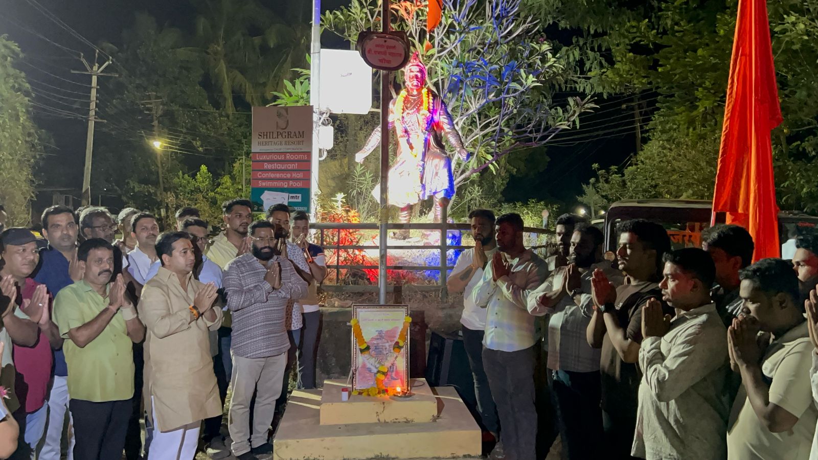 उभारण्यात आला आहे. आज रात्री उशीरा नितेश राणे यांनी या ठिकाणी भेट देत छ. संभाजी महाराजांच्या पुतळ्यास पुष्पहार अर्पण करून अभिवादन केलं. शंभूराजांसमोर नतमस्तक होत जय भवानी, जय शिवाजी, छ. संभाजी महाराज की जय, जय श्रीरामच्या घोषणा दिल्या. यावेळी जिल्हा बँक अध्यक्ष मनिष दळवी, विनायक रांगणेकर, दिनेश गावडे, कृष्णा धुळपनवर, श्रीकृष्ण सावंत, माजी आरोग्य सभापती सुधीर आडिवरेकर, माजी नगरसेवक उदय नाईक, गुरूनाथ मठकर, साईराज नार्वेकर, बंटी जामदार, शुभम घावरे, कुणाल शृंगारे, बंटी पुरोहित, लादू रायका, साईश परब यांसह बजरंग दल, विहींप, सकल हिंदू समाजबांधव उपस्थित होते. महिला भगिनी देखील मोठ्या संख्येने उपस्थिती होत्या.