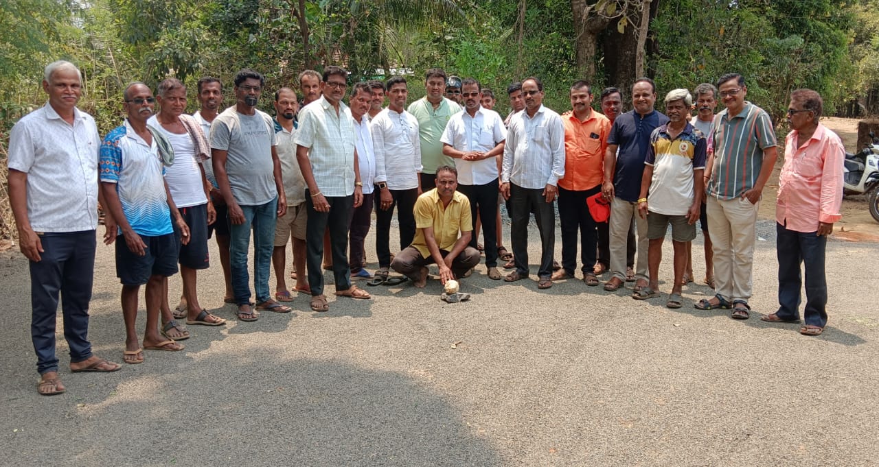 फोटो – आशिये मुख्यरस्ता ते आशिये ग्रामपंचायत जाणा-या रस्त्याचे श्रीफळ वाढवून लोकार्पण करताना सामाजिक कार्यकर्ते अनिल गुरव , सरपंच महेश गुरव व सोबत ग्रामस्थ