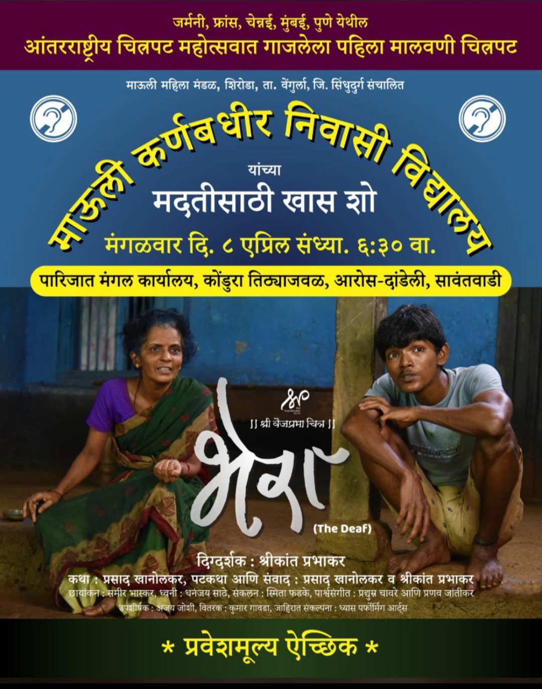 ⚡सावंतवाडी ता.०४-: माऊली महिला मंडळ,शिरोडा संचंलित माऊली कर्णबधिर निवासी विद्यालय यांच्या मदतीसाठी खास शो मंगळवार ८ एप्रिल रोजी संध्याकाळी ६.३० वाजता पारिजात मंगल कार्यालय,कोंडुरा तिठ्याजवळ आंतरराष्ट्रीय चित्रपट महोत्सवात गाजलेला पहिला मालवणी चित्रपट ‘ भेरा ‘ प्रवेशमूल्य हा चित्रपट होणार आहे लाभ घ्यावा असे आवाहन करण्यात आले आहे.