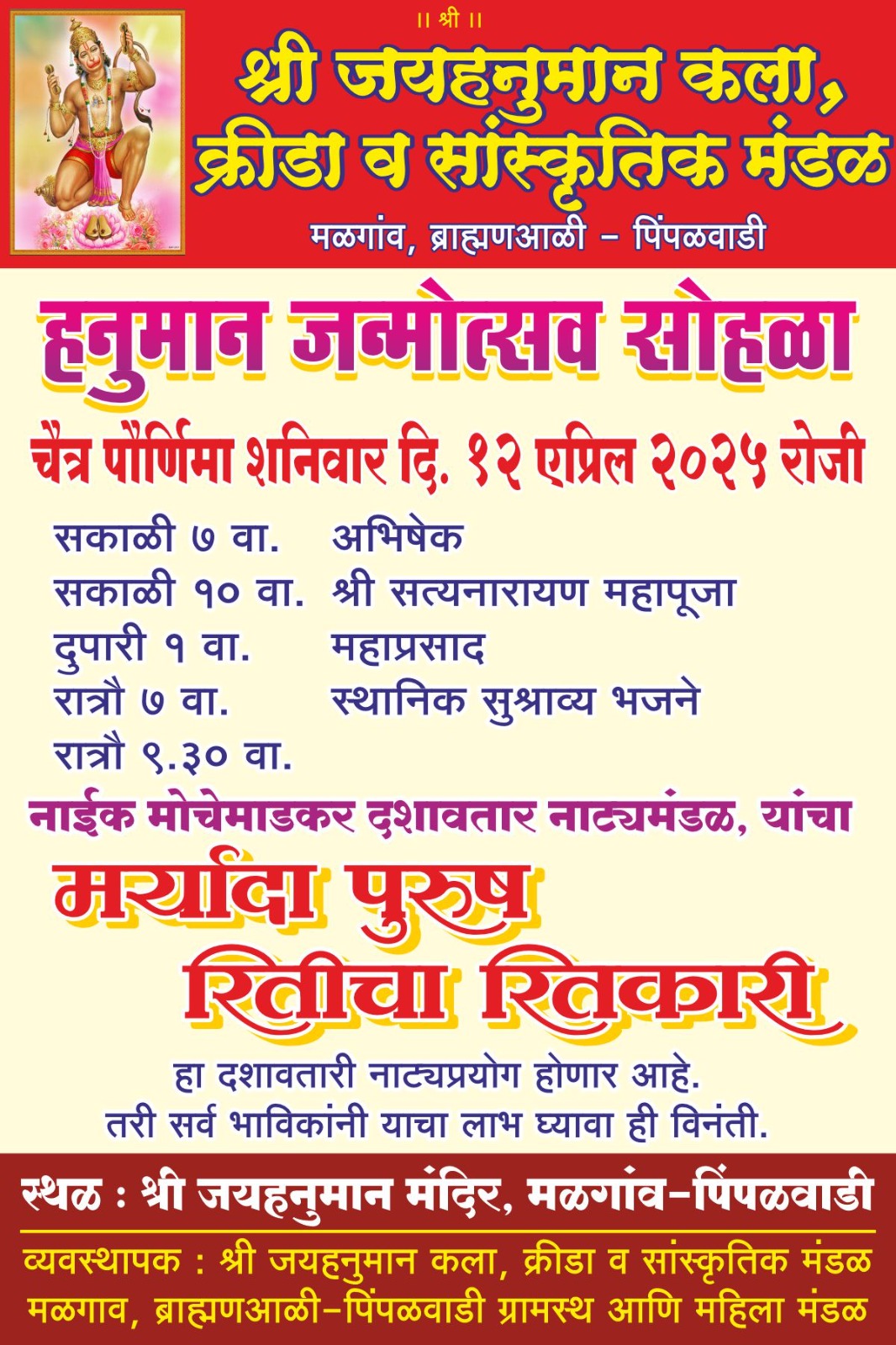 मळगाव ब्राह्मणआळी-पिंपळवाडी येथील श्री जयहनुमान कला, bक्रीडा व सांस्कृतिक मंडळ, ग्रामस्थ व महिला मंडळ यांच्यावतीने या सोहळ्याचे आयोजन करण्यात आले आहे. यनिमित्त सकाळी ७ वाजता अभिषेक सोहळा, १० वाजता श्री सत्यनारायण महापूजा, दुपारी १ वाजता महाप्रसाद, सायंकाळी ७ वाजता स्थानिक भजन मंडळांची भजने आदी कार्यक्रमांसहीत रात्री ९.३० वाजता नाईक मोचेमाडकर दशावतार नाट्यमंडळ, यांचा मर्यादा पुरुष रितीचा रितकारी हा पौराणिक दशावतारी नाट्यप्रयोग होणार आहे. भाविकांनी व नाट्यप्रेमींनी या सर्व कार्यक्रमांचा व नाट्यप्रयोगाचा लाभ घ्यावा, असे आवाहन श्री जय हनुमान कला, क्रीडा व सांस्कृतिक मंडळ, ग्रामस्थ आणि महिला मंडळाच्या वतीने करण्यात आले आहे.