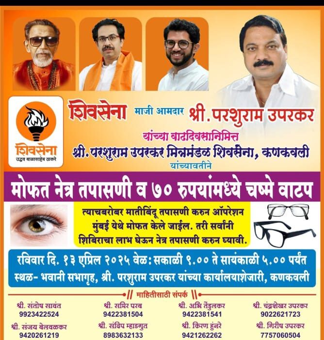 या शिबिराच्या अधिक माहितीसाठी संतोष सावंत 9923422524, संजय बेलवलकर 9420261219 प्रशांत उपरकर 8999076662, गणेश पारकर 9403819966, हेमंत उपरकर 8329819192, समिर परब 9422381504, संदीप म्हाडगुत 8983632133, प्रणव उपरकर 7083801557, बंटी तहसिलदार 9420733939, प्रविण कोरगावकर 9673190255, अभि तेंडुलकर 9422381541, किरण हुंनरे 9421262262, शैलेश नेरकर 7498976233, राजू कोरगावकर 8975800884, अनिल राणे 9689870250 पप्पू कोरगावकर 9404160488, टिकू कांबळी 9404861721, चंद्रशेखर उपरकर 9022621723, गिरीष उपरकर 7757060504, वैभव काणेकर 9423942621, सुहास सांडव 7030327608, सुनिल राणे 9860109482 यांच्याशी संपर्क साधावा, सर्वांनी शिबिराचा लाभ घेऊन नेत्र तपासणी करून घ्यावी असे आवाहन परशुराम उपरकर मित्रमंडळ शिवसेना कणकवली यांच्यावतीने करण्यात येत आहे.