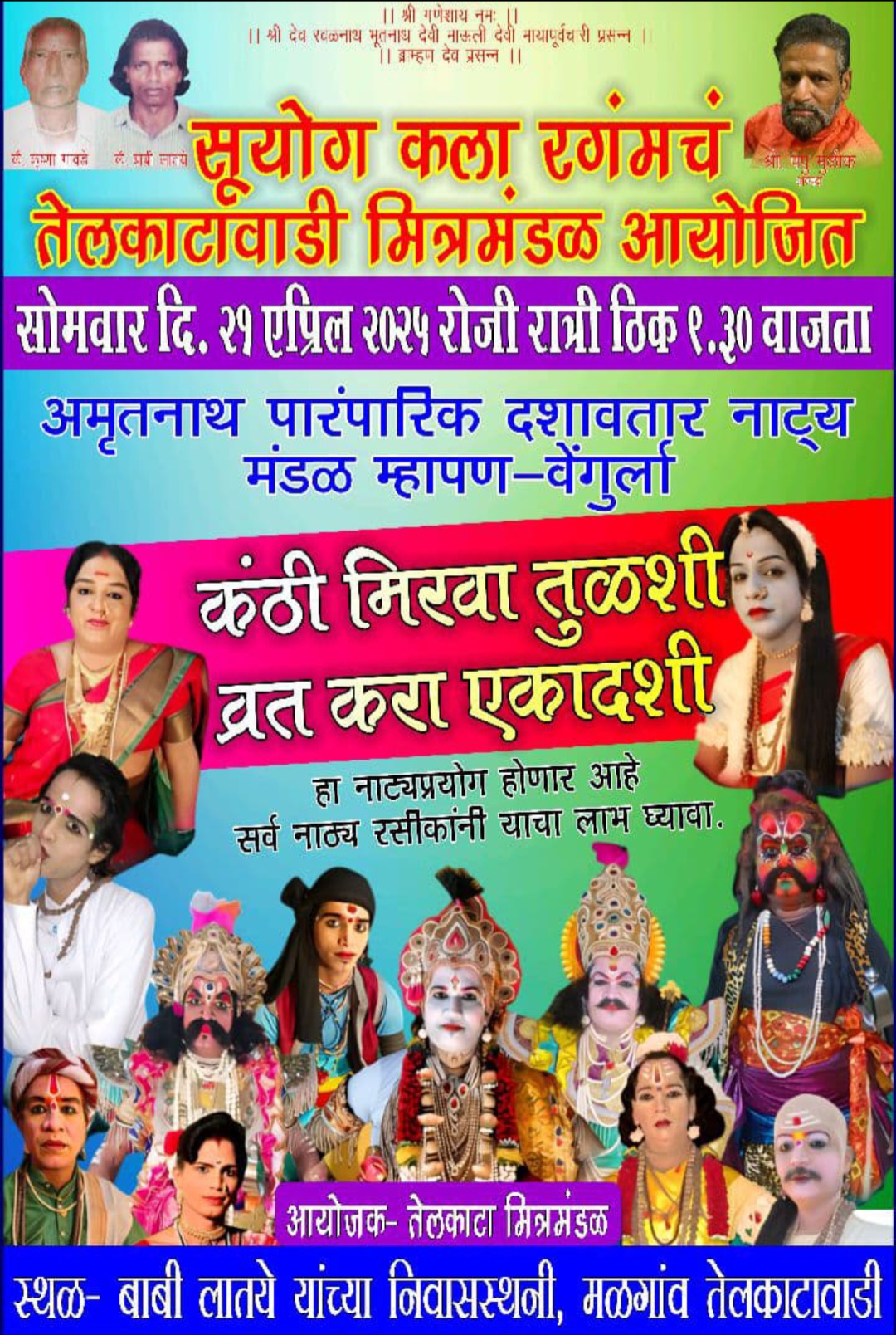 सूयोग कला रगंमंच व तेलकाटावाडी मित्रमंडळाच्यावतीने या नाट्यप्रयोगाचे आयोजन करण्यात आले आहे. या मंडळाच्यावतीने आयोजित नाट्यप्रयोगाचे यंदाचे हे २५ वे वर्ष आहे. सूयोग कला रगंमंच व तेलकाटावाडी मित्रमंडळ आयोजित व अमृतनाथ पारंपारिक दशावतार नाट्यमंडळ म्हापण-वेंगुर्ला प्रस्तुत कंठी मिरवा तुळशी व्रत करा एकादशी’ या नाट्यप्रयोगात अनिल गोसावी, करण खानोलकर, बाळू मांजरेकर, विनायक एरागी, दिनेश मराळ, पंढरीनाथ घाटकर, प्रशांत मेस्त्री, यश राणे, संदीप गावडे, समीर घाडी, दाजी मुंडये, चेतन कानडे, प्रशांत केरकर, सुरेश गोवेकर आदी कलाकार भुमिका साकारणार आहेत. तर त्यांना हार्मोनियम-प्रकाश सावंत, पखवाज-संतोष गोसावी, तालरक्षक-नरेंद्र किनळेकर संगीतसाथ करणार आहे. नाटकाची कथा संकल्पना अनिल गोसावी यांची आहे. मळगाव तसेच परिसरातील नाट्यप्रेमींनी विठ्ठल भक्तीवर आधारित असलेल्या या नाट्यप्रयोगाचा लाभ घ्यावा, असे आवाहन सूयोग कला रगंमंच व तेलकाटावाडी मित्रमंडळाच्यावतीने करण्यात आले आहे.