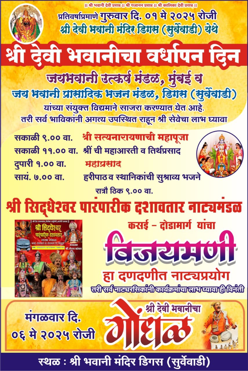 कुडाळ : प्रतिवर्षाप्रमाणे डिगस सुर्वेवाडी येथील श्री देवी भवानी मंदिर येथे गुरुवार दि. 1 मे 2025 रोजी श्री भवानी देवीचा वर्धापनदिन जयभवानी उत्कर्ष मंडळ (मुंबई) व जय भवानी प्रासादिक भजन मंडळ, डिगस (सुर्वेवाडी) यांच्या संयुक्त विद्यमाने साजरा करण्यात येणार आहे. तसेच मंगळवार दि. 6 मे 2025 रोजी श्री देवी भवानीचा गोंधळ उत्सव साजरा करण्यात येणार आहे.