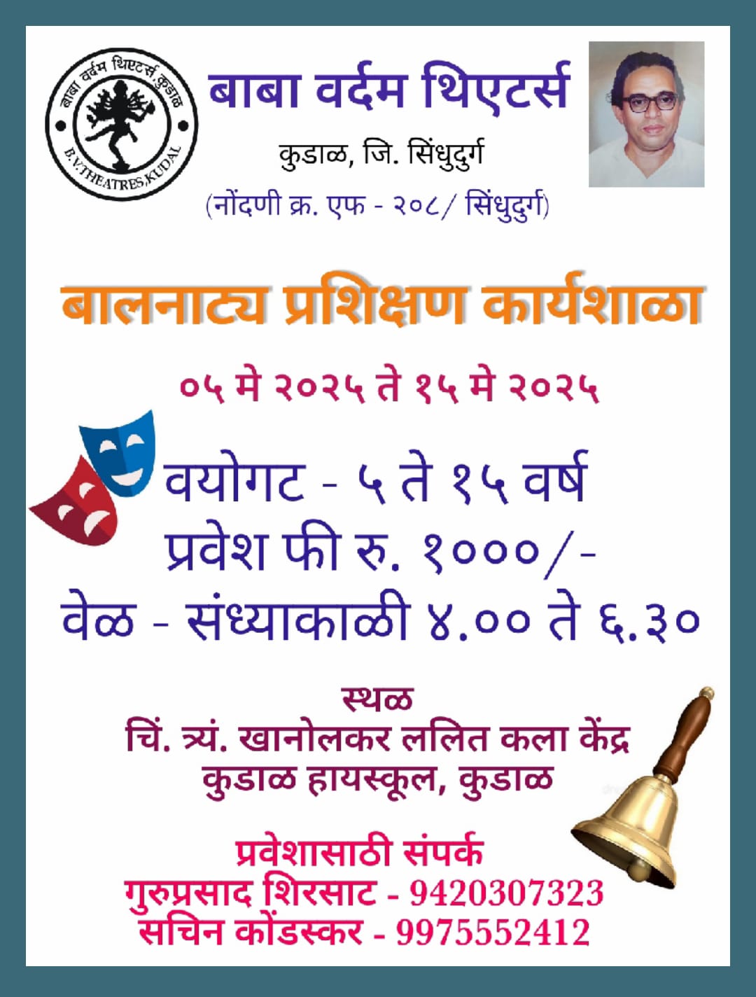 बाबा वर्दम थिएटर्स, कुडाळ ही सिंधुदुर्ग जिल्ह्यातीलच नव्हे तर संपूर्ण महाराष्ट्रात आणि शेजारच्या राज्यात नावलौकिक असलेली आणि ५३ वर्षांची यशस्वी नाट्य परंपरा असलेली नाट्यसंस्था आहे. ही संस्था वर्षभर अनेक सांस्कृतिक उपक्रम यशस्वीपणे राबवित असते. बाल रंगभूमीसाठी सुद्धा या संस्थेचे फार मोठे योगदान आहे. या संस्थेच्या वतीने येत्या ५ मे ते १५ मे या कालावधीत बालनाट्य प्रशिक्षण कार्यशाळेचे आयोजन करण्यात आले आहे. चिं. त्र्यं. खानोलकर ललित केंद्र, कुडाळ हायस्कुल येथे दररोज सायंकाळी ४.०० ते ६.३० या वेळेत ही कार्यशाळा होणार आहे. यासाठी वय वर्षे ५ ते १५ हा वयोगट आहे. ही कार्यशाळा सशुल्क आहे. या बालनाट्य प्रशिक्षण कार्यशाळेत शोण घुर्ये आणि साहिल देसाई हे नाट्यशास्त्र पदवी अभ्यासक्रम पूर्ण केलेले मार्गदर्शक मार्गदर्शन करणार आहेत. प्रवेशासाठी आणि अधिक माहितीसाठी गुरुप्रसाद शिरसाट (९४२०३०७३२३) किंवा सचिन कोंडस्कर (९९७५५५२४१२) यांच्याशी संपर्क साधायचा आहे. या कार्यशाळेत मोठ्या संख्येने सहभागी व्हावे असे आवाहन बाबा वर्दम थिएटर्सच्या अध्यक्षा सौ. वर्षा वैद्य यांनी केले आहे.