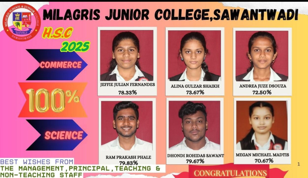 ⚡सावंतवाडी ता.०६-: मिलाग्रीस ज्युनियर कॉलेज ने जाहीर झालेल्या निकालानुसार यावर्षीही शंभर टक्के यशाची परंपरा कायम राखली आहे.