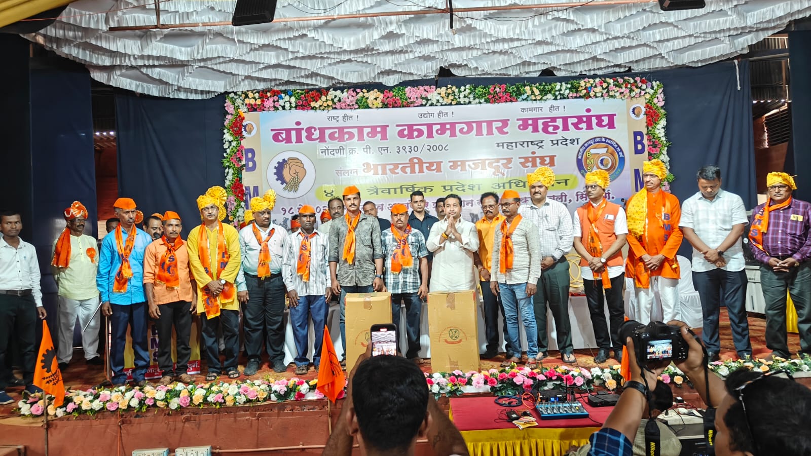 भारतीय मजदूर संघाच्या,बांधकाम कामगार महासंघ महाराष्ट्र प्रदेश चे ४ थे वार्षिक प्रदेश अधिवेशन कणकवली येथे आयोजीत करण्यात आले होते. यावेळी मंत्री नितेश राणे बोलत होते. यावेळी व्यासपीठावर भाजपा कणकवली तालुका अध्यक्ष मिलिंद मेस्त्री, कणकवली माजी उपनगराध्यक्ष बंडू हर्णे , रत्नागिरी सिंधुदुर्ग जिल्ह्याचे सहाय्यक कामगार आयुक्त संदेश आयरे, भारतीय मजदूर संघ प्रदेश अनिल ढुमणे, भारतीय मजदूर संघाचे प्रदेश महामंत्री किरण मिलगिरी, प्रदेशाध्यक्ष हरी चव्हाण, प्रदेश संघटन मंत्री उमेश महाडिक, प्रदेश कोषाध्यक्ष बाळकृष्ण कांबळे, प्रदेश सरचिटणीस संजय सुरोशे, जिल्हाध्यक्ष भगवान साटम, जिल्हा कोषाध्यक्ष ओमकार गुरव, जिल्हा सचिव हेमंतकुमार परब आदि पदाधिकारी उपस्थित होते.