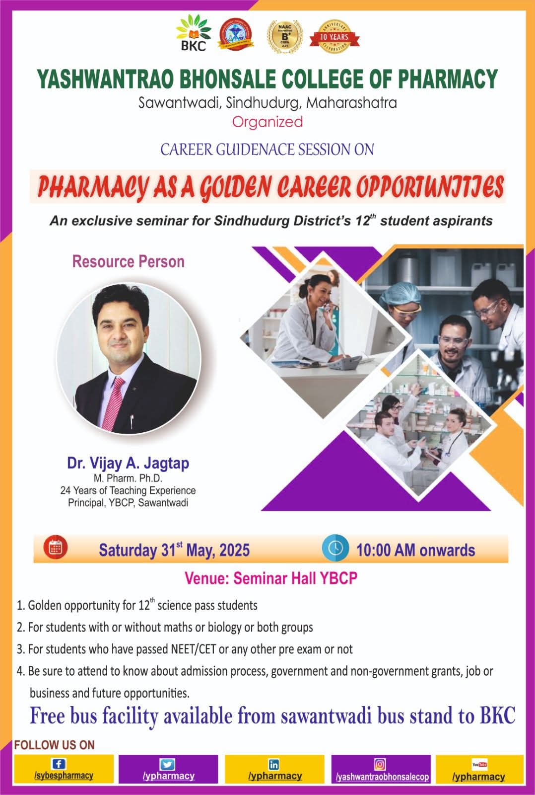 ⚡सावंतवाडी ता.२८-: यशवंतराव भोसले फार्मसी कॉलेजच्या वतीने शनिवार, दि.३१ मे रोजी सकाळी १० वाजता बारावी उत्तीर्ण विद्यार्थ्यांसाठी फार्मसी अभ्यासक्रमावर मार्गदर्शन सत्राचे आयोजन करण्यात आले आहे. राज्य सामाईक प्रवेश परीक्षा कक्ष व तंत्रशिक्षण विभागाच्या वतीने ऑनलाईन प्रवेश प्रक्रिया सुरु होत आहे. याच पार्श्वभूमीवर विद्यार्थ्यांना प्रवेश प्रक्रियेचे टप्पे, आवश्यक कागदपत्रे, शासकीय शिष्यवृत्ती तसेच करिअर संधी याविषयी माहिती मिळावी या हेतूने या सत्राचे आयोजन करण्यात आले आहे._